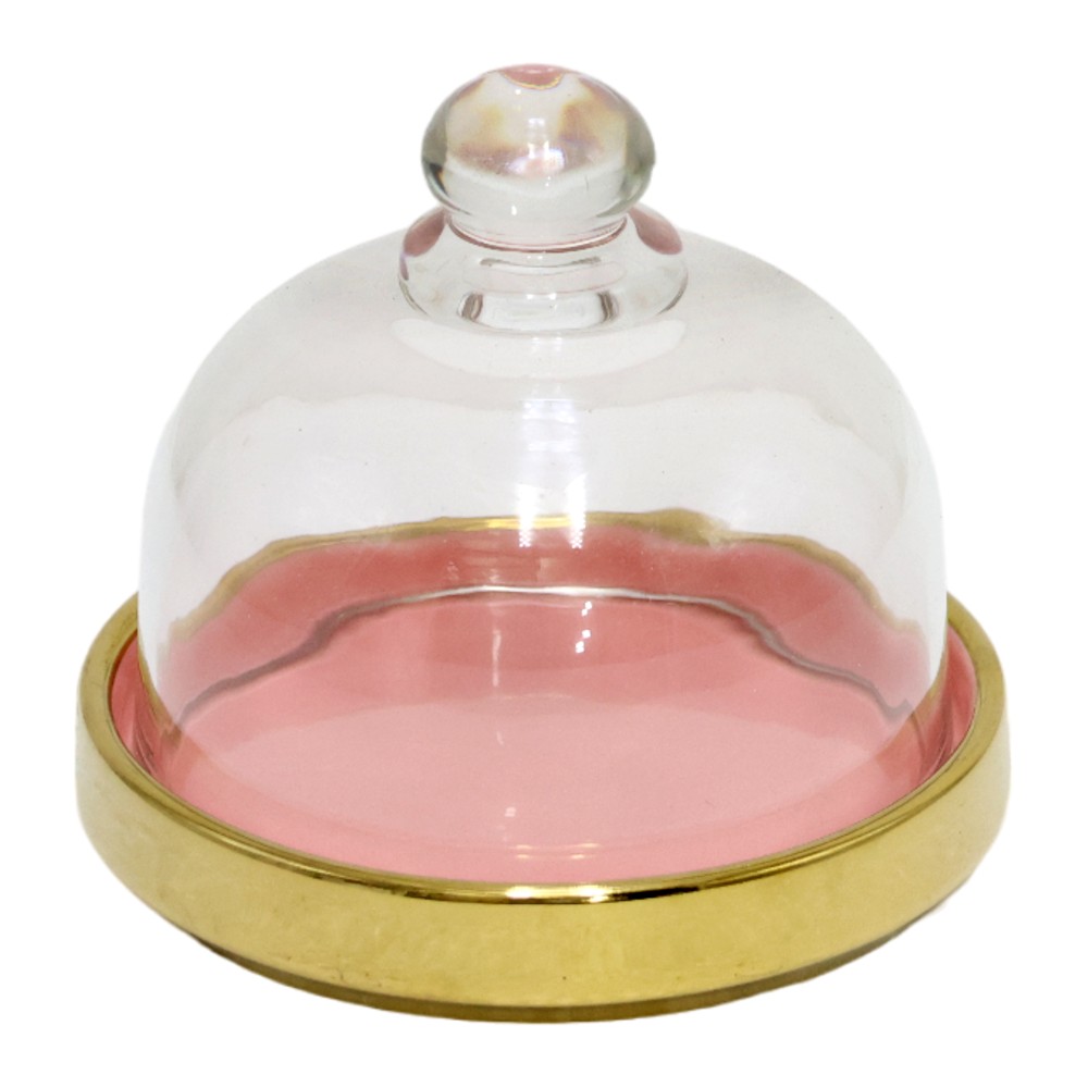 Mbajtëse e veçantë për kek, e realizuar nga qelqi dhe metal në ngjyrën transparente me detaj floriri, me diametrin 9 cm. Ky produkt ofron një prezantim tërheqës për kekun dhe ëmbëlsirat tuaja të preferuar.