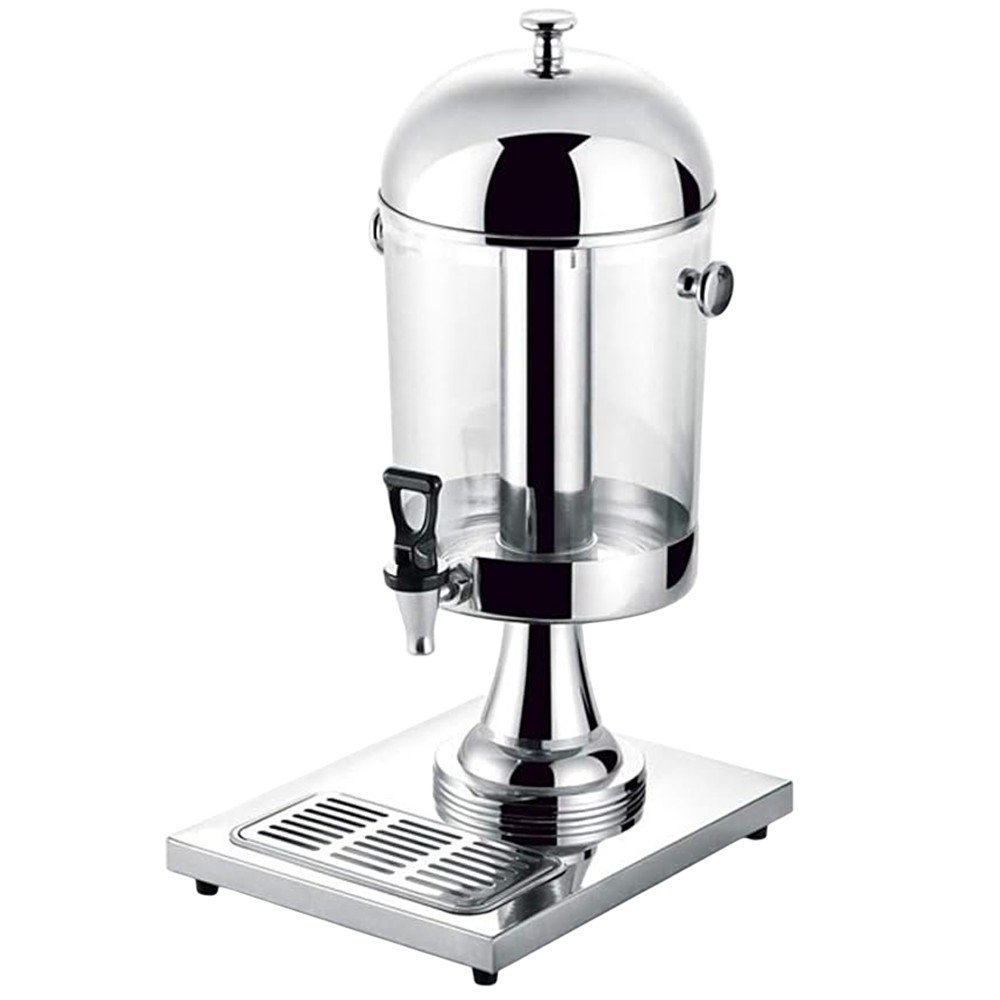 Kjo mbajtëse lëngjesh teke është një pajisje elegante dhe praktike, e dizajnuar për të shërbyer lëngje të freskëta në hotele, restorante, bufete, dhe evente të ndryshme. Me kapacitetin e saj 5 litra, ajo është ideale për mbajtjen e lëngjeve në temperaturë të përshtatshme dhe shërbimin e tyre në mënyrë tërheqëse. Kombinim i inoksit (çelik inox) dhe pleksiglasit, duke ofruar qëndrueshmëri, higjienë dhe transparencë. Materialet e lehta për t'u pastruar sigurojnë higjienë maksimale dhe përdorim të sigurt. Mekanizmi i shpërndarjes së lëngjeve është i thjeshtë dhe i lehtë për t'u përdorur, duke minimizuar humbjet dhe rrëmujën. E përshtatshme për lëngje të ndryshme, si lëng portokalli, lëng molle, ujë, etj.