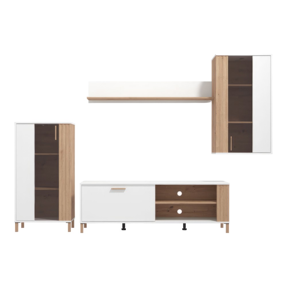 Mbajtëse televizori dhe ekspozitor, Bastia, melaminë, lisi natyral/e bardhë, 280x40xH170 cm