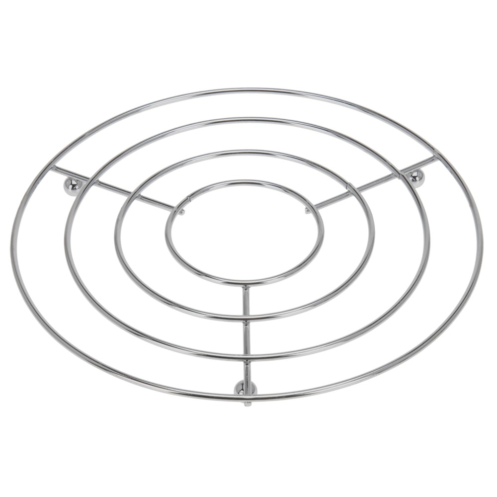 Mbrojtësja kundër nxehtësisë Trivet, është një aksesor praktik dhe estetik për kuzhinën tuaj. Me një diametër prej 20 cm, ajo ofron një sipërfaqe të sigurt për vendosjen e tenxhereve apo enëve të nxehta, duke mbrojtur tavolinat nga dëmtimet e shkaktuara nga temperatura e lartë. Struktura e fortë prej metali siguron stabilitet dhe jetëgjatës. E domosdoshme për përdorim të përditshëm dhe perfekte për kuzhina funksionale dhe të organizuara.