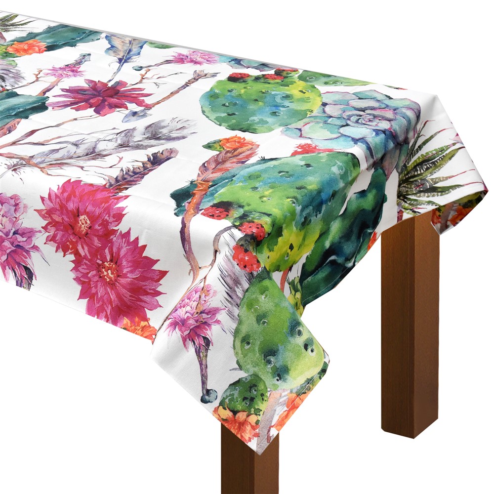 Mbulesë tavoline, Panama, prej materiali pambuk në përmasë 140x240 cm, e bardhë, me lule rozë e jeshile. E përshtatshme për përdorim familjar.