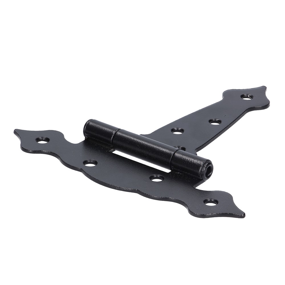 Menteshë dekorative në formë T-je, prej materiali zinku të galvanizuar, me veshje të jashtme Duplex, me përmasa 12.5x4x16x0.25 cm, në ngjyrë të zezë. Materiali përbërës është i qëndrueshëm ndaj përdorimit, peshave të rënda, ndryshkut apo gërryerjes. Përdoret për montimin e dyerve të vogla, dyerve të jashtme të gardheve, kapakëve të sëndukëve dhe përdorime të tjera.
