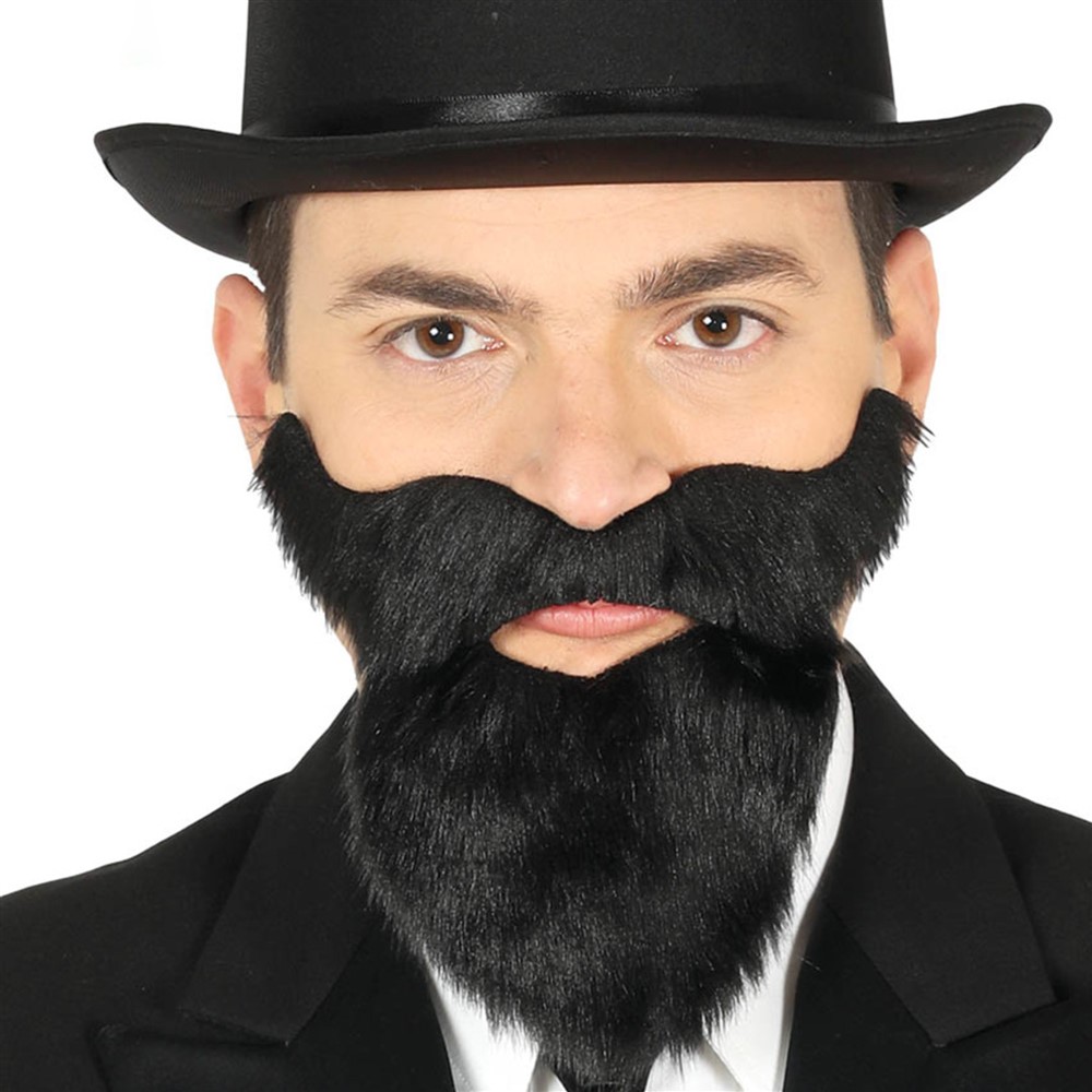 Një mjekër e plotë me mustaqe të zeza. E cila ngjitet me ngjitësin e dyanshëm të përfshirë në paketim.
