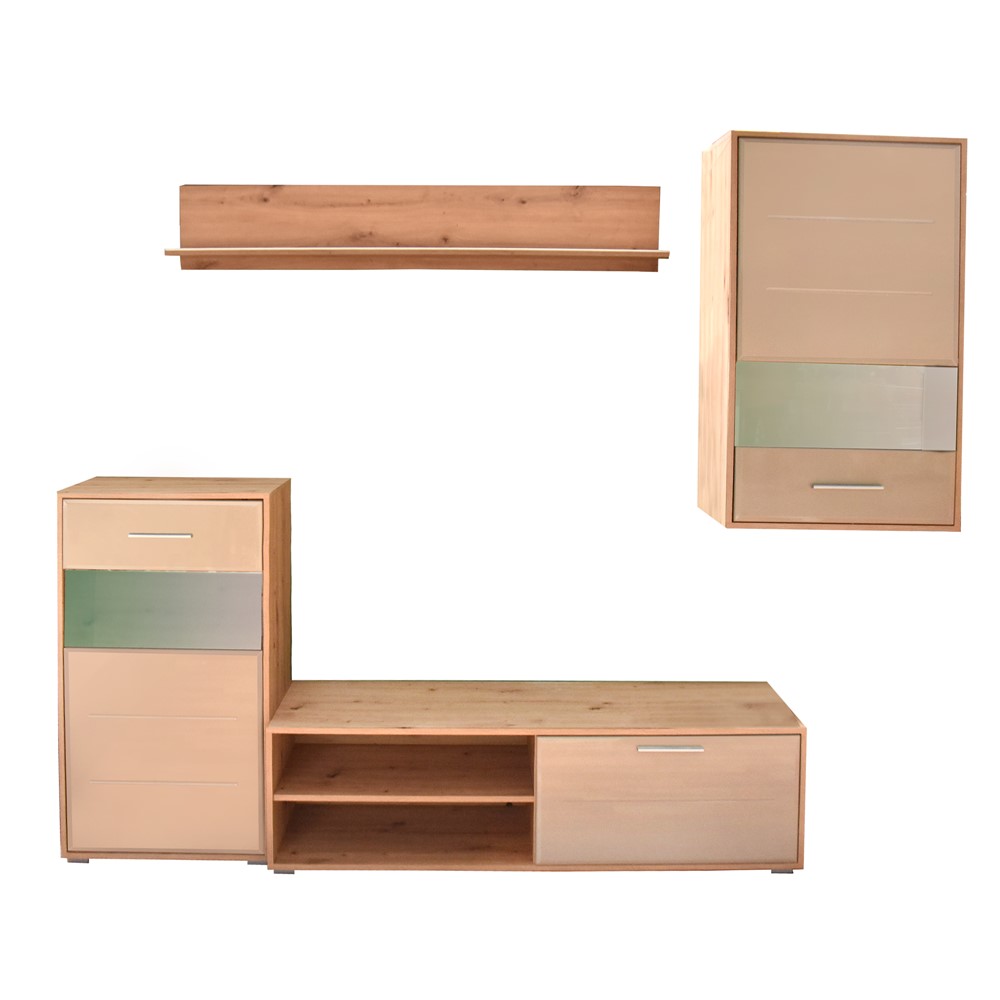 Mobilje televizori dhe ekspozitor FERROL në ngjyrë lisi artizanal dhe fletë llaku ngjyrë rëre është një model elegant. Përbëhet nga një kombinim i rafteve të hapura, të mbyllura dhe gjysëm xham si dhe një rafti mural. është një zgjidhje moderne për çdo shtëpi moderne.