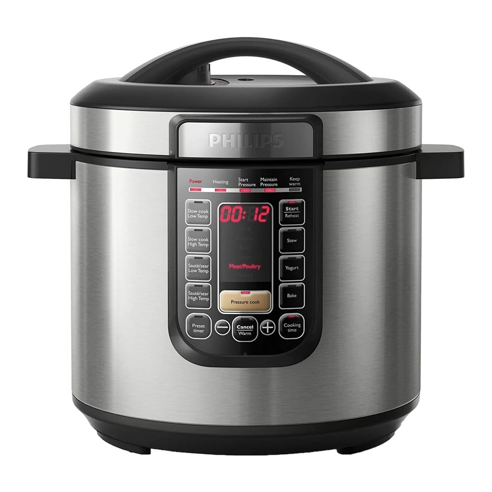 Multicooker, Philips All-in-One . Fuqia e përmirësuar shkurton në mënyrë efikase kohën e paranxehjes. Së bashku me sistemin inteligjent të gatimit, ju mund të gatuani ngadalë, të gatuani me presion dhe të gatuani shumë ushqime të shijshme në një pajisje me lehtësi. Programe shtesë për shumë gatime, duke përfshirë zierjen në avull, pjekjen dhe përgatitjen e kosit për të krijuar edhe më shumë pjata dhe ëmbëlsira. Mbajtja automatikisht e ngrohtë për 12 orë (përveç funksioneve të kosit dhe Saute/Sear), duke i mbajtur ushqimet të këndshme dhe të ngrohta për t'u shërbyer në çdo kohë. Fuqia e përmirësuar shkurton në mënyrë efikase kohën e paranxehjes me 25%, në mënyrë që të mund të shijoni përvojën e gatimit edhe më të shpejtë*. Gatimi i ngadaltë me cilësime të temperaturës së lartë dhe të ulët krijon butësi. 7 mënyra gatimi nën presion ju ndihmojnë të krijoni shije të mrekullueshme kur jeni të varfër me kohë. Me veshjen ProCeramic+, tenxherja është 5 herë më e qëndrueshme se ato konvencionale. Sipërfaqe më e mirë rezistente ndaj gërvishtjeve për përdorim më të gjatë*. Dizajn i kapakut të brendshëm të ndashëm që pastrohet lehtë. 9 sisteme mbrojtëse sigurie për të siguruar gatim pa tension.
