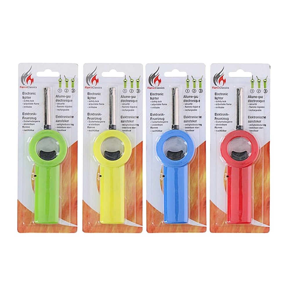 Ndezës zjarri, me gaz, prej materiali plastik, me majë metalike, me përmasa 18x4.9x1.7 cm, në ngjyra të ndryshme. Përdoret për të ndezur me lehtësi zjarrin në oxhakë, barbekju, skara, në kamping apo piknik, për ndezjen e vatrave të gazit në kuzhinë apo për ndezjen e qirinjve. Ky produkt është i lehtë dhe praktik në përdorim dhe mund të rimbushet pasi mbaron.