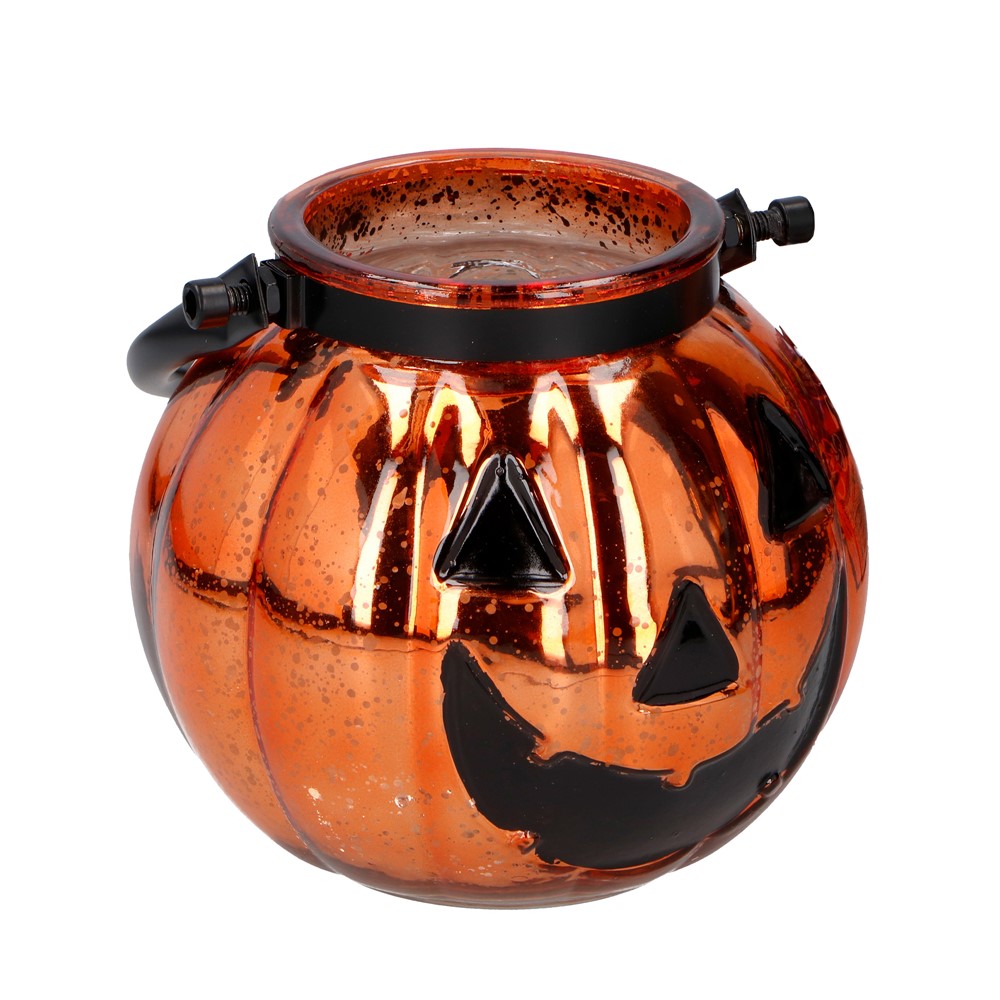 Ndriçues dekorativ për Halloween, në formë kungulli, prej materiali qelqi gjysmëtransparent, në ngjyrë portokalli dhe të zezë. Ndriçuesi është i pajisur me një dorezë mbajtëse metalike dhe me 10 llamba LED, të cilat punojnë me 2 bateri AA, të cilat nuk janë të përfshira në paketim. Përdoret për dekorimin e ambienteve të brendshme dhe të jashtme gjatë festës së Halloween-it. Ky produkt është i përshtatshëm për përdorim në ambiente jo-profesionale, si ambientet e shtëpive, shkollave, etj., dhe profesionale, si bizneset, hotelet, restorantet, baret, etj.