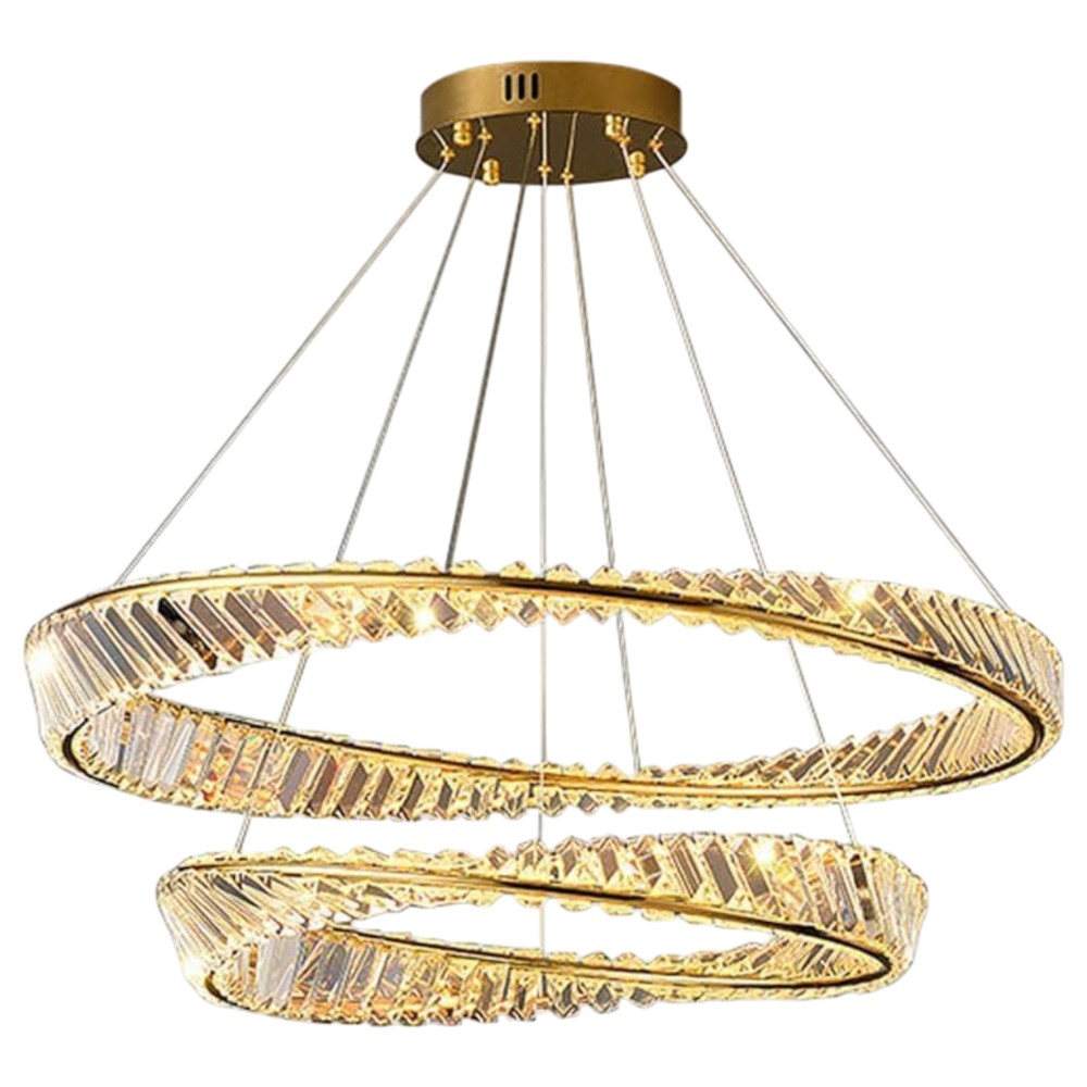 Ndriçues i varur LED 134W me dritë të rregullueshme 3000–6400K dhe ndriçim shumë të fuqishëm 12,000 lm. Dizajn luksoz prej kristali në ngjyrë gold, me diametra 60 dhe 80 cm. I përshtatshëm për ambiente të mëdha dhe elegante si sallone pritjeje, dhoma ndenjeje apo ambiente festive.