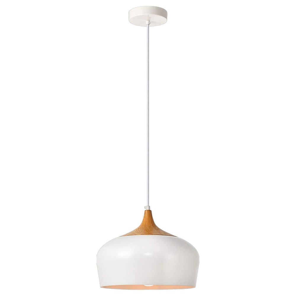 Ndriçues i varur me bazë E27, diametër 30 cm, lartësi 25 cm, prej metalit dhe drurit, në ngjyrë të bardhë. Stil modern dhe natyral, i përshtatshëm për ndriçim dhe dekor elegant në ambiente të ndryshme shtëpiake apo komerciale.