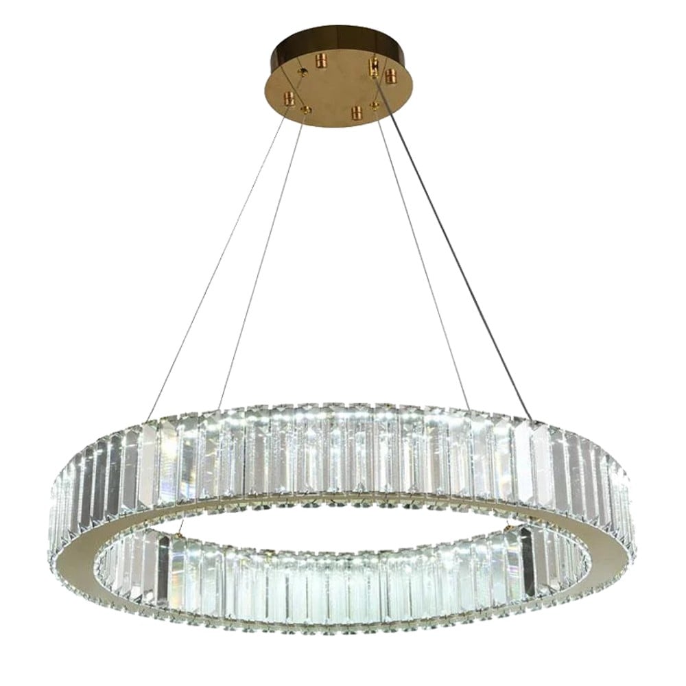 Ndriçues i varur LED me fuqi 40W dhe fluks ndriçimi 3300 lm. Ka diametër 60 cm dhe elementë dekorativë 6.8 × 6.8 × 1.5 cm, i realizuar nga metal dhe kristal me përfundim gold, duke siguruar ndriçim të sofistikuar dhe një pamje luksoze për ambientin.