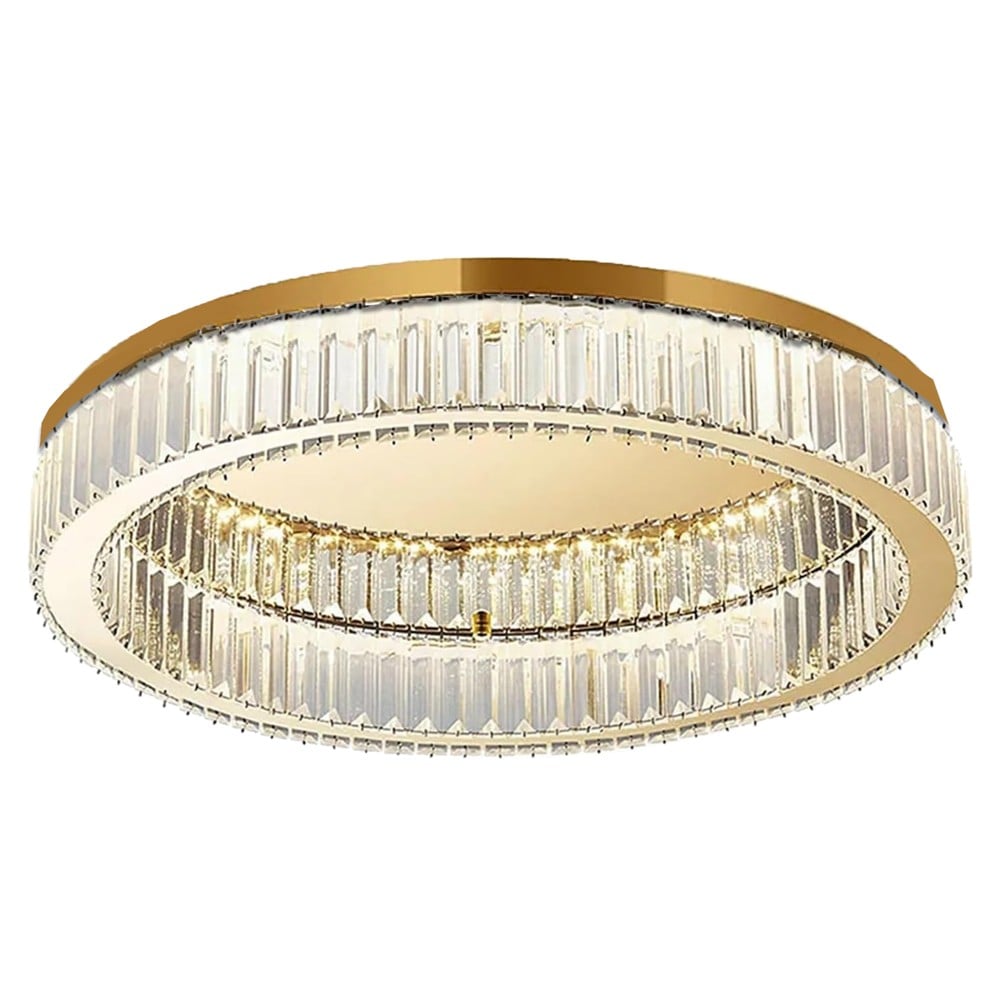 Ndriçues tavani LED me fuqi 40W, ngjyrë drite 3000K dhe fluks ndriçimi 3300 lm. Ka diametër 60 cm dhe lartësi 12 cm, i realizuar nga metal dhe kristal me përfundim gold, duke ofruar ndriçim të ngrohtë dhe një pamje luksoze dhe elegante për ambientin.