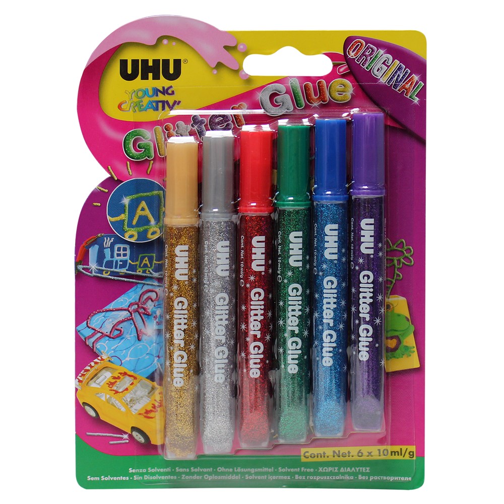 UHU kreativ, ngjitës GLITTER mund të krijojë vezullime në shumë materiale të ndryshme. Krijoni piktura, kartolina urimi, korniza fotosh dhe shumë më tepër me efekte shkëlqimi shtesë. Tubet ekstra i butë me majë me saktësi precize të lejon një aplikim të lehtë dhe të pastër. UHU është gjithashtu pa tretës dhe mund të lahet. Ky paketim përfshin 6 ngjyra të ndryshme prej ari, argjendi, e kuqe, jeshile, blu dhe vjollcë. Çdo tub përmban 10 ml.