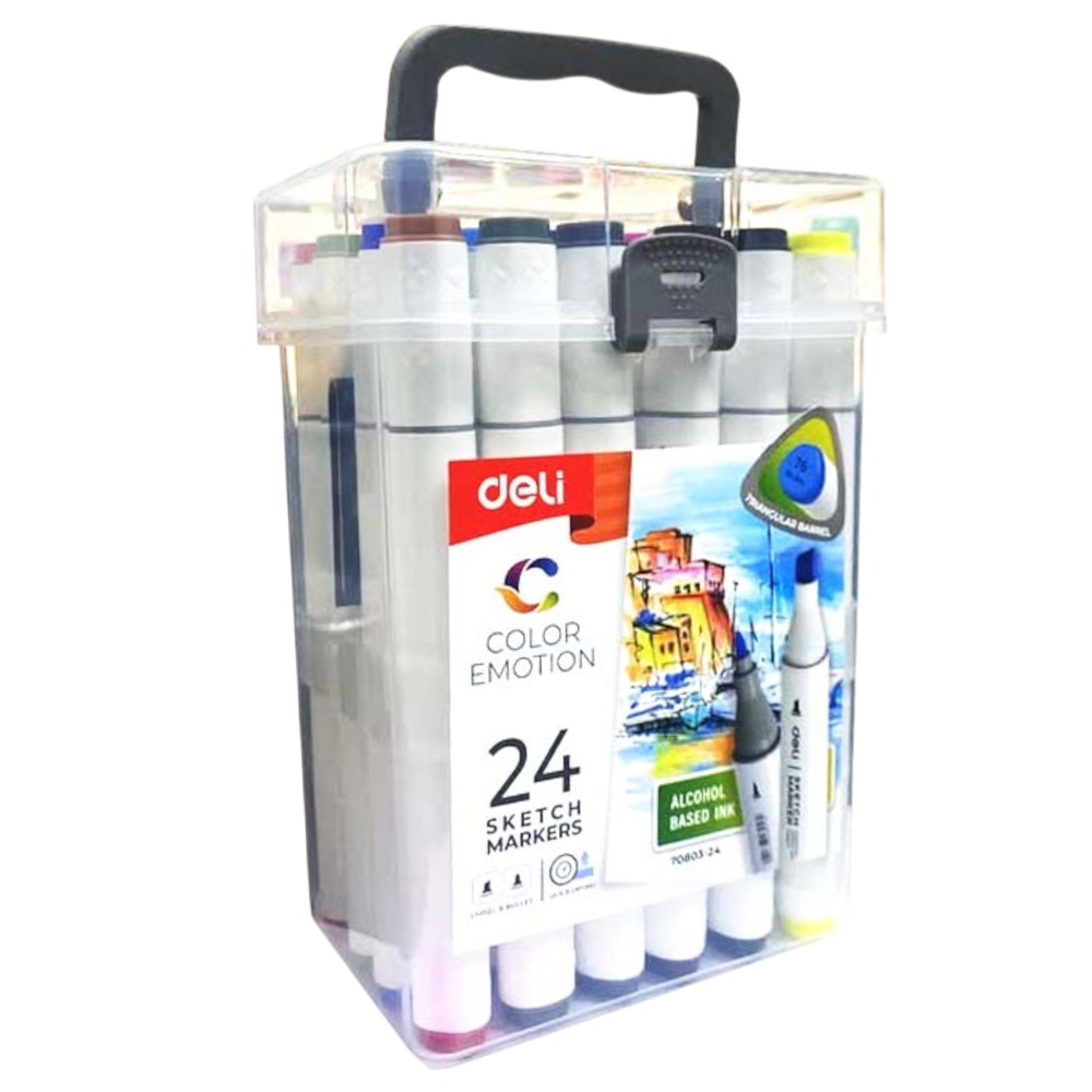 Ky set me 24 ngjyra alkoli nga Deli, i dizajnuar për Sketch Emotion, është ideal për vizatime profesionale, ilustrime dhe projekte kreative. Secili marker ka dy maja: një majë e hollë për detaje të sakta dhe një majë e trashë për mbulim uniform dhe ngjyrosje të shpejtë. Ngjyrat e gjalla dhe të qëndrueshme e bëjnë këtë set të përshtatshëm për artistë të vegjël, studentë dhe të apasionuar pas artit. Materialet e sigurta dhe rezistente sigurojnë përdorim të gjatë dhe rezultat profesional.