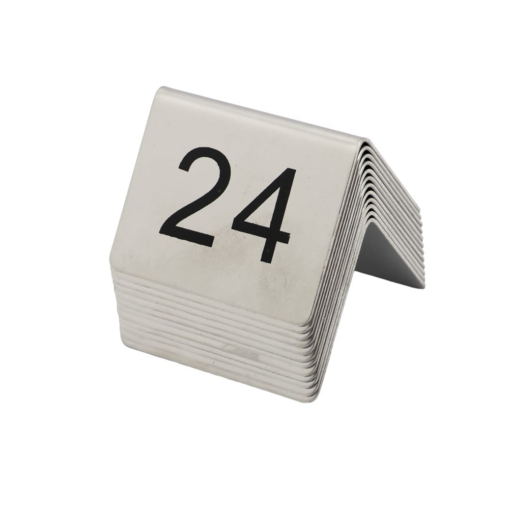 Numrat e tavolinës 13–24 janë të prodhuar nga inoks cilësor, me ngjyrë argjendi dhe përfundim të lëmuar. Me dimension 5×5 cm, ata ofrojnë qëndrueshmëri dhe dukshmëri të lartë, duke i bërë të përshtatshëm për restorante, kafene dhe evente që kërkojnë identifikim profesional të tavolinave.
