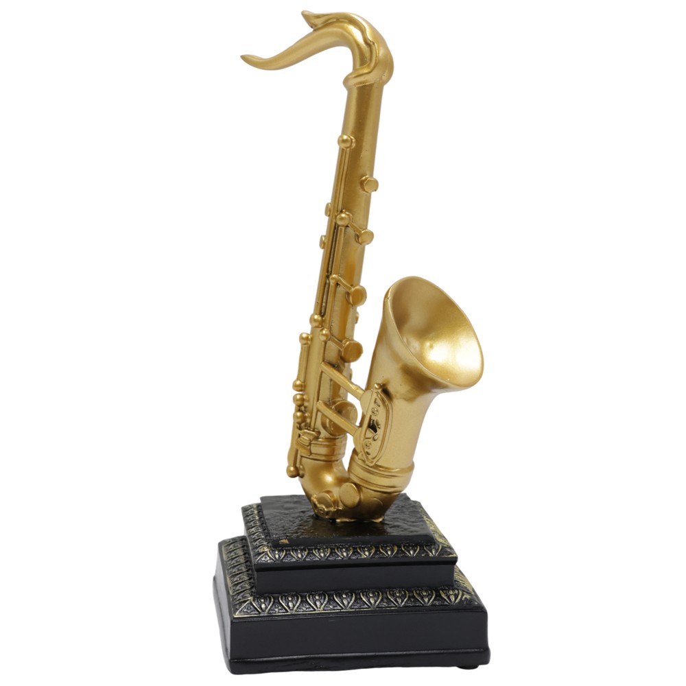 Kjo figurë dekorative prej rezine përfaqëson një ndërthurje të bukurisë moderne me elegancën klasike. Ngjyra e zezë, e kombinuar me detaje në ngjyrë floriri, krijon një kontrast të rafinuar që bie në sy, ndërsa struktura e ndërtuar me rezinë cilësore siguron jetëgjatësi dhe qëndrueshmëri. Ky objekt është perfekt për ata që duan të sjellin thellësi vizuale dhe një element të veçantë në dekorin e tyre, pa e mbingarkuar hapësirën. Pavarësisht nëse e vendosni mbi një komodinë, tavolinë, bibliotekë apo zyrë, ai do të tërheqë vëmendjen dhe do të plotësojë estetikisht çdo ambient.