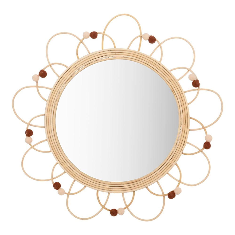 Pasqyrë muri në formë të rrumbullakët dhe pom-pom rreth e rrotull. Është prej druri bastun prej palme kacavjerrëse në një nuancë natyrale. Diametri i pasqyrës pa kornizë është 22 cm. Ideale për vendosje në dhomën e fëmijëve ose të bebeve.