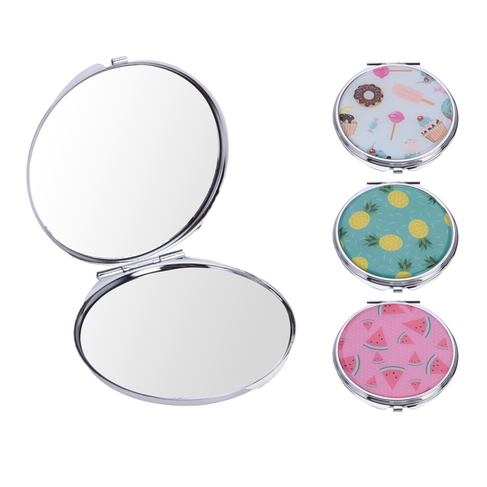 Pasqyrë xhepi për makeup, me 2 anë të palosshme, me strukturë prej materiali plastike ABS dhe metal, në ngjyra dhe dizajne të ndryshme, në formë rrethore, me përmasa Ø7 cm. Krahët e palosshëm lejojnë një pamje më të mirë të fytyrës dhe rezultate më të mira. Mund të merret kudo me vete falë përmasave të vogla. Ky produkt është i përshtatshëm për përdorim personal për kujdesin e fytyrës dhe makeup.