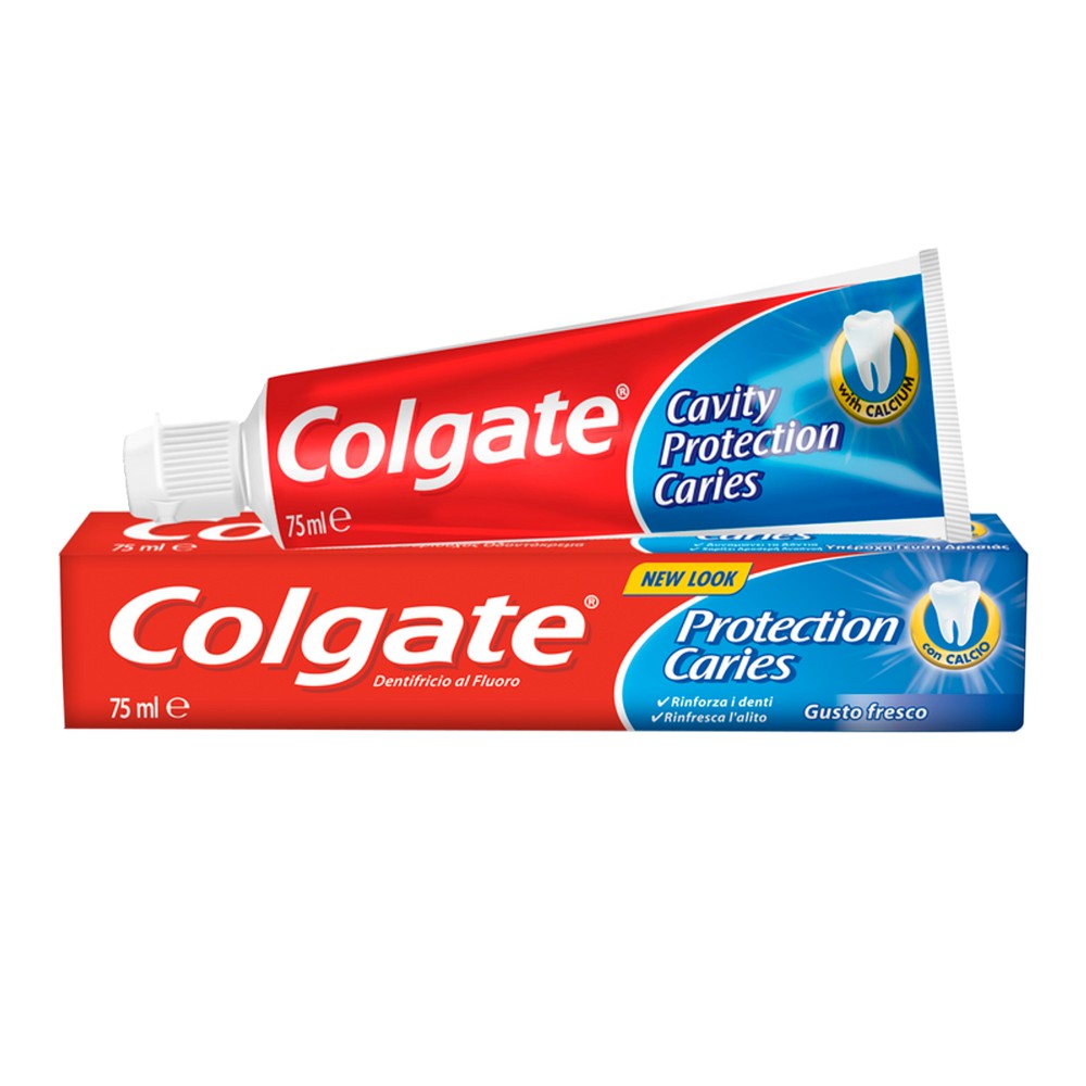 Pasta e dhëmbëve Colgate Caries Protection përmban fluor aktiv dhe kalcium. Falë formulës së saj me kalcium, pasta e dhëmbëve Colgate arrin edhe hapësirat ndërdhëmbore për mbrojtje të avancuar kundër kaviteteve. Është vërtetuar klinikisht se forcon dhëmbët dhe ndihmon në rimineralizimin e zonave të dobësuara të smaltit. Pasta e dhëmbëve ka një shije të freskët menteje që freskon frymëmarrjen, lufton prishjen e dhëmbëve dhe rrënjët e ekspozuara.