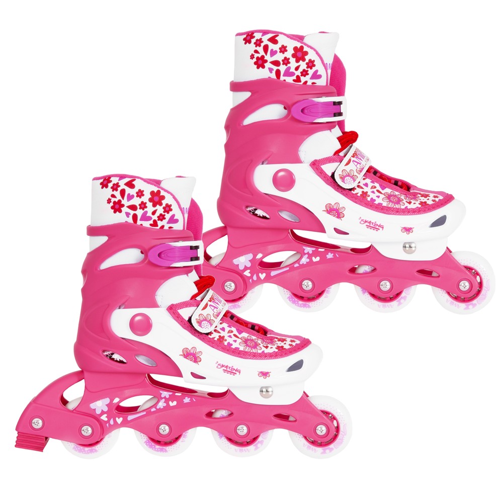 Patinat Amila kane nje dizajn elegant dhe madhesi te regullueshme, ne kete menyre femijet mund ta shijojne ate per disa vite pa u shqetesuar per humbjen e madhesise se tyre! Kepuca e rregullueshme ne tre madhesi me leve kyçese dhe kapese me rrip 45 grade per pershtatje dhe stabilitet me te mire. Struktura e kepuces perbehet nga rrjete e forte, per ajrosje maksimale gjate patinimit. Ne pjesen e pasme, struktura suportohet nga material plastike e forte, me qellim rritjen e qendrueshmerise dhe stabilitetit.