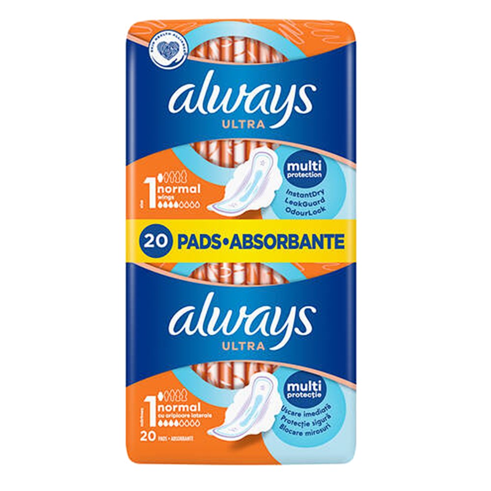 Pecetat higjienike Always Ultra Normal me krahë përdorin teknologjinë më të fundit dhe janë multifunksionale me 3 elementë mbrojtës. Sistemi InstantDry largon lagështinë nga lëkura. Ato përmbajnë teknologjinë OdourLock, e cila neutralizon erën, kështu që ju mund të ndiheni të pastër dhe të freskët. I miratuar dermatologjikisht nga Skin Health Alliance.