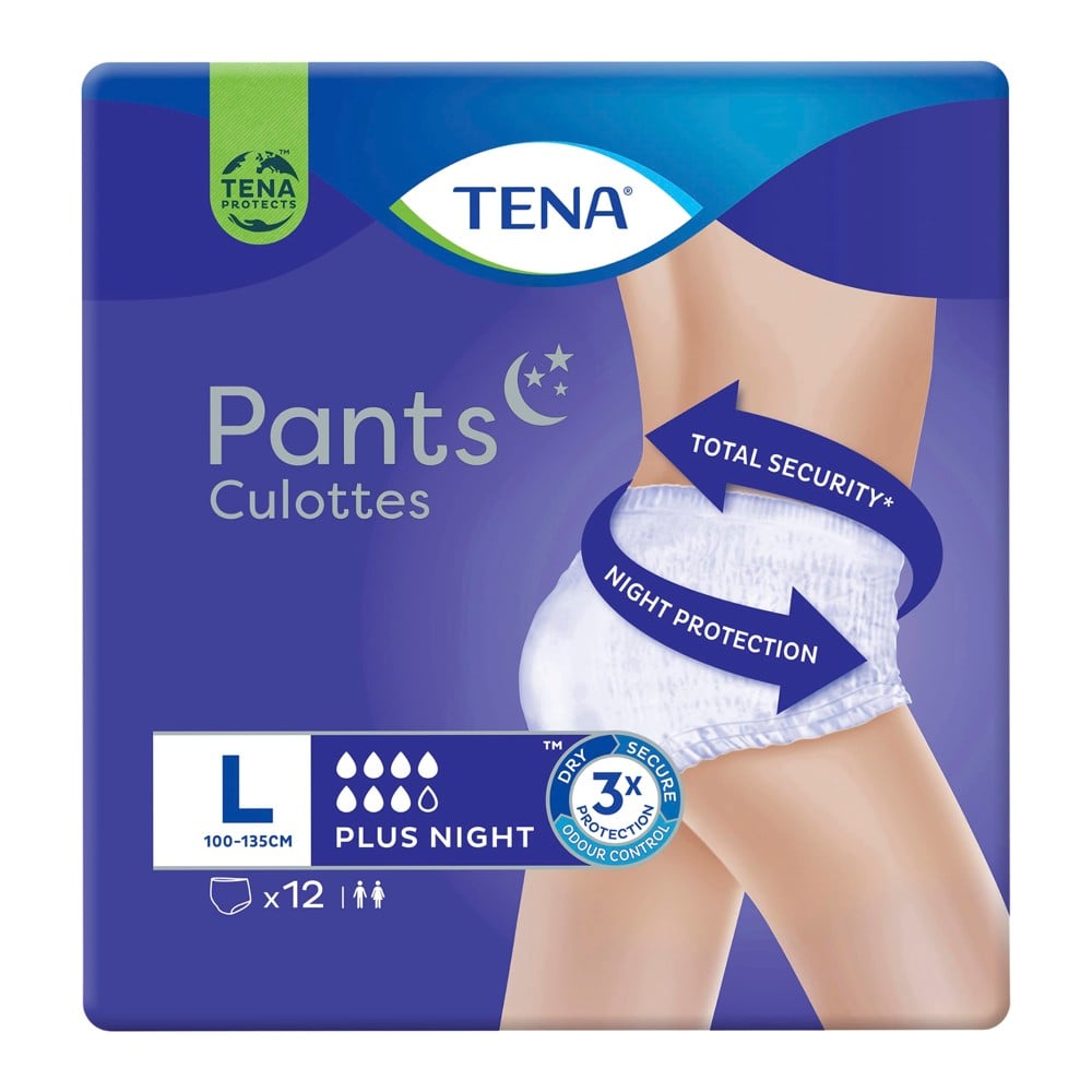 Tena Pants Plus Night (madhësia L) është projektuar si për meshkuj ashtu edhe për femra dhe ideale për t'u veshur gjatë natës. Këto pantallona inkontinence ofrojnë rehati të butë, mbrojtje të shtrirjes dhe siguri totale nga çdo rrjedhje, aromë apo lagështi. Plus Night janë të lehta për t'u veshur dhe ndjehen njësoj si të brendshmet e zakonshme, duke ju mbajtur të thatë dhe të sigurt.