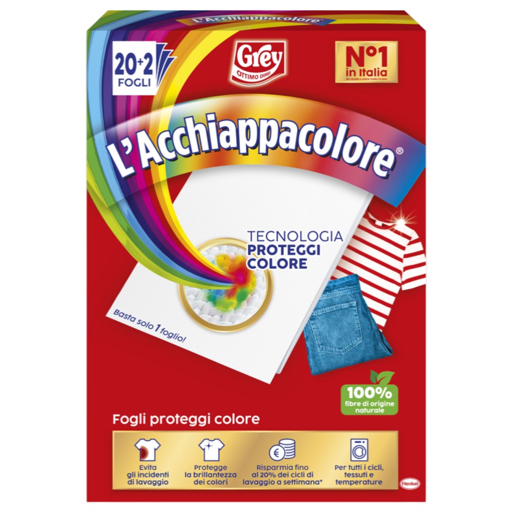 Shpëtimi i rrobave nga ngjyrosjet aksidentale bëhet i thjeshtë me pecetat Grey L'Acchiappacolore. Të bërë nga fibra të biodegradueshme dhe natyrale, këto peceta kapin ngjyrat e lëshuara gjatë larjes për të parandaluar kalimin e tyre tek rrobat e tjera, duke ruajtur shkëlqimin e ngjyrave. Mjafton vetëm një pecetë për të larë ngarkesa të përziera pa shqetësime. Efektive për të gjitha llojet e fibrave, ciklet e larjes dhe temperaturat, duke kursyer ujë, energji dhe kohë.
