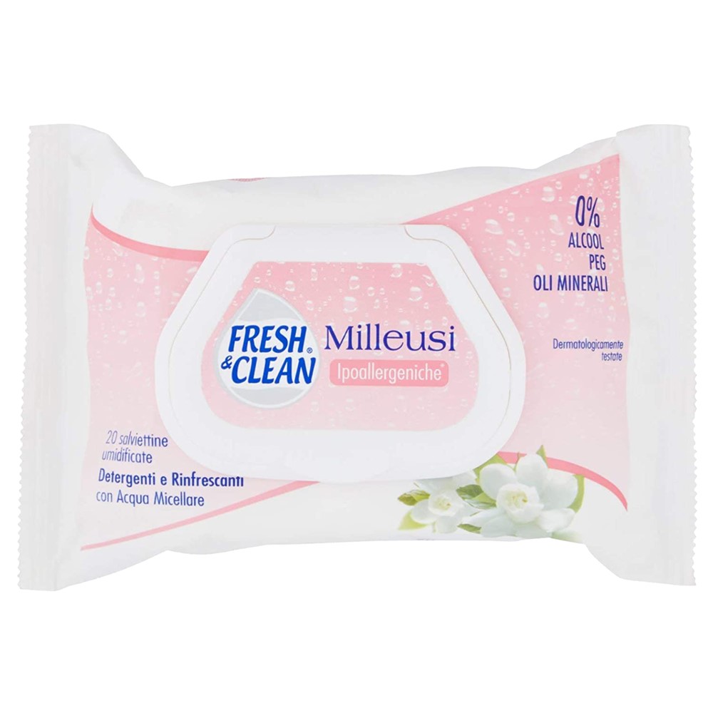 Peceta të lagura hipoalergjike Fresh&Clean Milleusi shumëpërdorimshe falë ujit micelar dhe përbërjes pa alkool, PEG dhe vajra mineral. Janë të përshtatshme për pastrimin e lëkurave të ndjeshme dhe delikate. Paketimi përmban 20 peceta. I testuar dermatologjikisht.