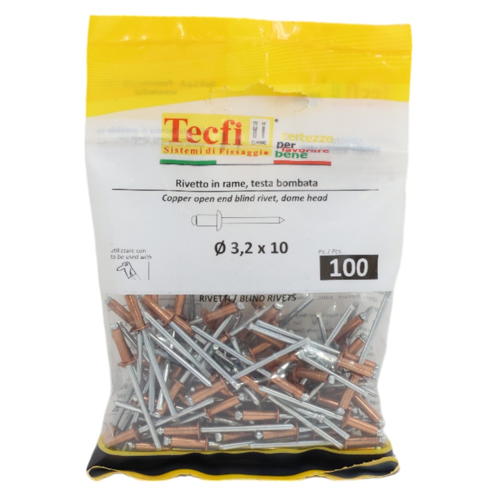 Open end dome head blind rivets, copper/zp steel, Ø 3,2x10mm, Bag 100