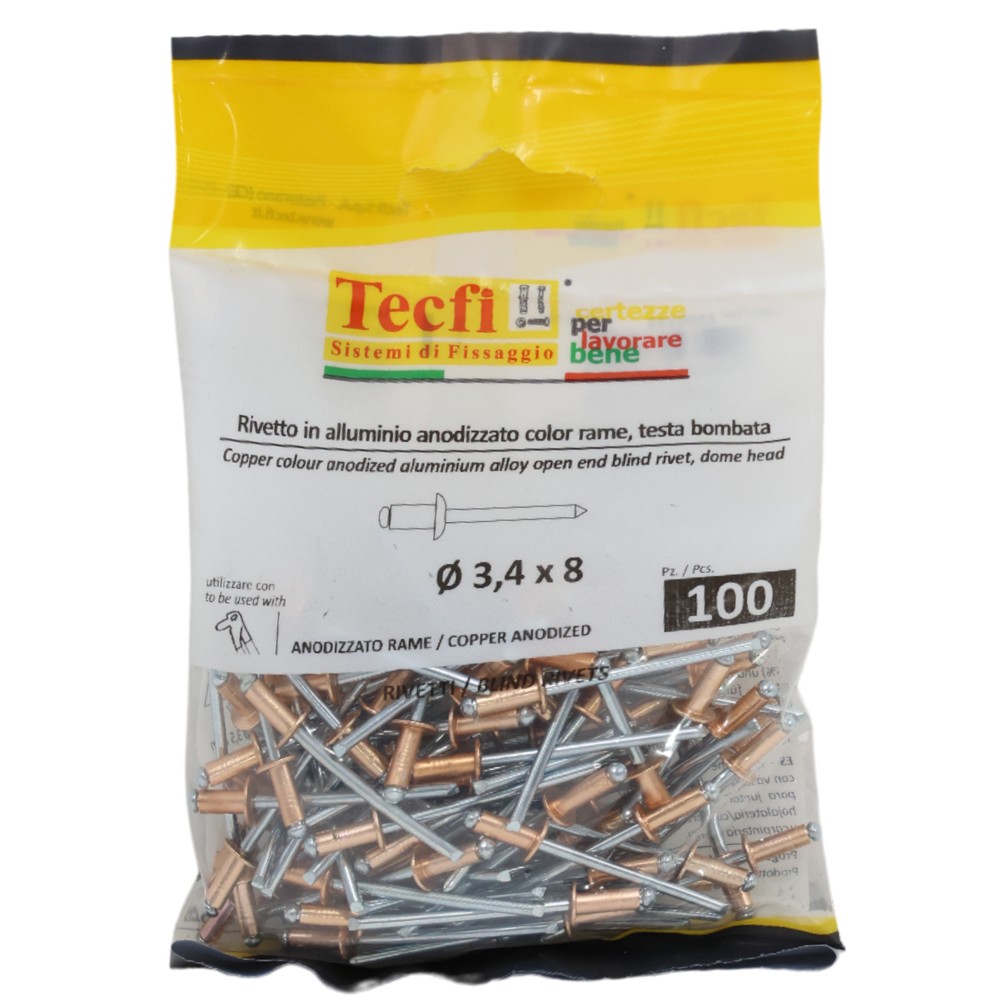 Perçina alumini anodizuara me ngjyrë bakri /çeliku, Ø 3,4 x 8mm , Bag 100