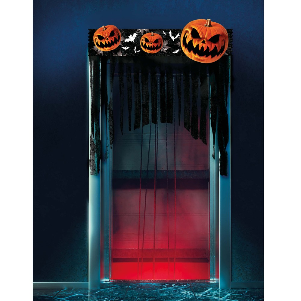 Perde dere me kunguj në përmasë 90x30cm. Kjo perde dere prej material poliestër me fije është një aksesor I vecantë për dekorimin e Halloween.