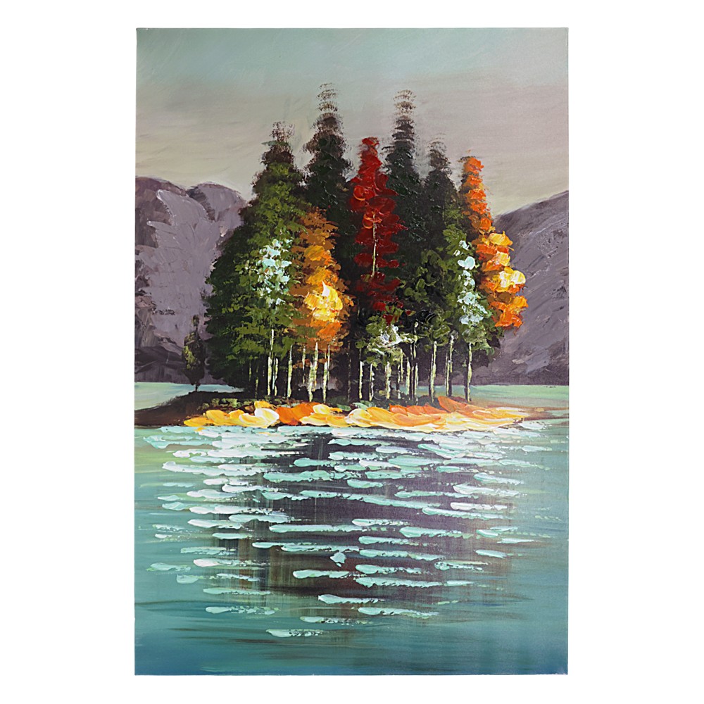 Një peisazh i qetë dhe meditativ, me përmasa 60x90 cm, që paraqet një grup pemësh të gjata dhe të dendura, të cilat reflektohen qetësisht në sipërfaqen e ujit. Ngjyrat e vjeshtës, nga e gjelbra tek nuancat e verdha dhe portokalli, krijojnë një kontrast të ngrohtë me sfondin e maleve dhe qiellit. Piktura transmeton një ndjenjë paqeje dhe qetësie, duke ftuar shikuesin të ndalojë dhe të humbasë mendimet në natyrën e paprekur. Drita e diellit përforcon atmosferën magjike, duke theksuar hijeshinë e çdo gjetheje dhe pasqyrimin në ujë. Çdo detaj tregon një harmoni perfekte midis elementeve natyrore, duke e bërë këtë peisazh një oaz shpirtëror për ata që kërkojnë qetësi dhe reflektim të thellë.