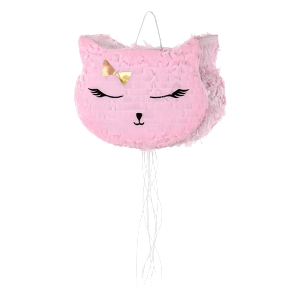 Pinata në formë mace në ngjyrën rozë për tu mbushur me ëmbëlsira si karamele, embëlsira te vogla etj, përmasa përafërsisht. 35 x 27 x 9 cm. E përshtatshme për tu perdorur për festa. Nëpërmjet saj fëmijët mund të argetohen duke e gjuajtur atë për të përfituar gjërat e mira mbrenda saj.