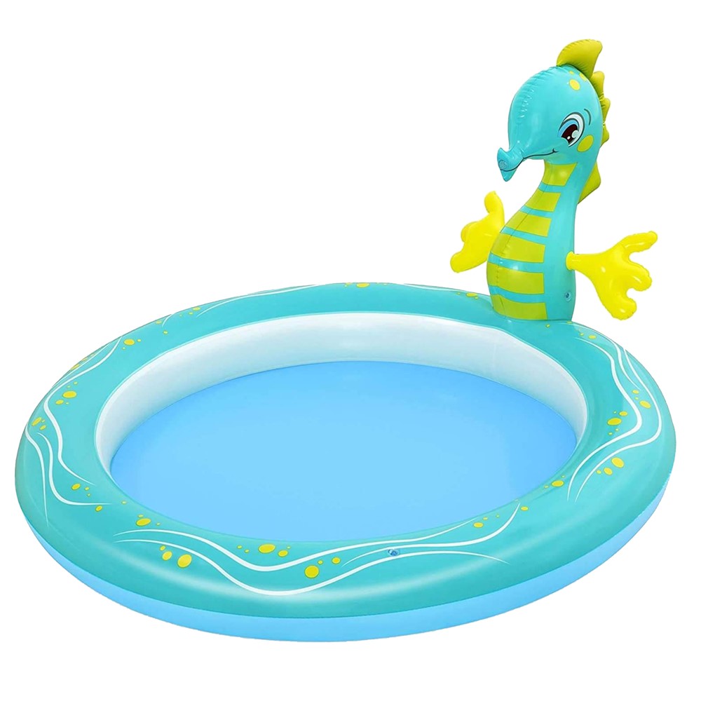 Bestway® Seahorse Sprinkler Sprinkler Pool është një pishinë interaktive, duke e bërë atë lodrën e përsosur të oborrit të shtëpisë për fëmijët aventurierë. Pishina e rrumbullakët përmban dizajne tërheqëse dhe një kalë deti të fryrë. Thjesht lidhni një zorrë kopshti dhe kali i detit do të funksionojë si një pishinë që fryhet për edhe më shumë argëtim. Me një gjerësi prej 188 centimetrash, pishina e vozitjes ofron hapësirë të mjaftueshme për disa fëmijë për të shijuar pishinën e vozitjes së Seahorse deri në perëndim të diellit. Montimi dhe çmontimi është projektuar të jetë po aq i shpejtë dhe i lehtë.