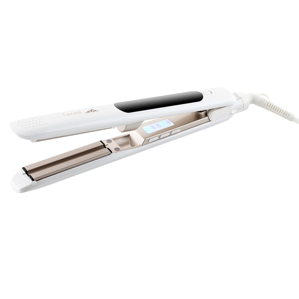Pavarësisht nëse keni flokë të shkurtër apo të gjatë, me pjastrën e flokëve ETA FENITÉ do të keni rezultatet e një salloni bukurie. Ju do të pëlqeni drejtuesin e flokëve në një dizajn modern të bardhë me perla. Me kutinë e udhëtimit, lehtë mund ta paketoni për udhëtime. Ngrohja e shpejtë e pllakave ju lejon të filloni të krijoni stilin tuaj në një kohë shumë të shkurtër. Sipërfaqja qeramike-turmalinë e pllakave me përmasa 25 x 90,5 mm është shumë e butë për flokët tuaj. Përzgjedhja e temperaturës nga 160 në 220 ° C mund të drejtojë të gjitha llojet e flokëve. Treguesit e dritës do t'ju informojnë për temperaturën aktuale të zgjedhur dhe funksionin e caktuar. Stiluesi ETA FENITE ka një funksion të avulli. Me avull, flokët tuaj do të trajtohen në mënyrë efektive dhe të shpejtë. Kapaciteti i depozitës është 7.5 ml dhe ju siguron deri në 20 minuta avull. Depozita e ujit është e lëvizshëme për mbushje të lehtë.