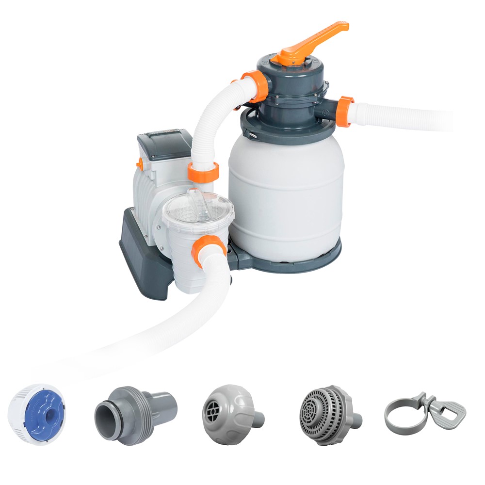 Pompë filtruese Flowclear™ me depozitë me rërë, prej materiali plastik, i cili është rezistent ndaj ujit, kushteve atmosferike dhe gërryerjes që shkaktohet për shkak të veprimit të agjentëve kimikë dhe elektro-kimikë. Pompa punon me tension 220-240 V dhe fuqi 230 W, ka një sistem të kontrollit të filtrit të pajisur me një valvulë me 6 pozicione dhe është e pajisur me një kohëmatës, i cili lejon vendosjen e një kohëzgjatjeje të automatizuar të procesit. Përdoret me rërë silici me kokrriza me diametër 0.45-0.85 mm dhe shërben për pastrimin dhe qarkullimin e ujit të pishinës, duke filtruar pluhurat, papastërtitë dhe bakteret. Depozita e brendshme e pompës është e përbërë nga material rezistent ndaj ujit, i cili nuk ndryshket, ka diametër 27 cm, ka kapacitet mbajtës të rërës prej 8.5 kg dhe është e pajisur me një sitë për ndarjen e gjetheve dhe papastërtive të tjera të mëdha. Rëra e silicit (kodi 110274) përmban 99% SiO2, filtron papastërti të vogla deri në 20 mikron dhe ka veti antibakteriale dhe antimikrobiale. Pompa ka sistem filtrimi me kapacitet 5678 l/orë dhe përfshin konektorë me diametër 3.2 cm dhe gjatësi 3 m, të cilët e bëjnë të përshtatshme për t'u përdorur me valvulë lidhëse me diametër 3.8 cm dhe me të gjitha pishinat Bestway me kapacitet prej 1100 deri 18100 litrash. Seti gjithashtu përmban: • Një dispenser klori ChemConnect, i cili përdoret për të ruajtur nivelin optimal të klorit në ujin e pishinës, duke mbajtur pishinën të pastër për një kohë të gjatë. • Aksesorë të tjerë që mundësojnë montimin e pompës dhe lidhjen e pompës me sistemin e filtrimit të pishinës.