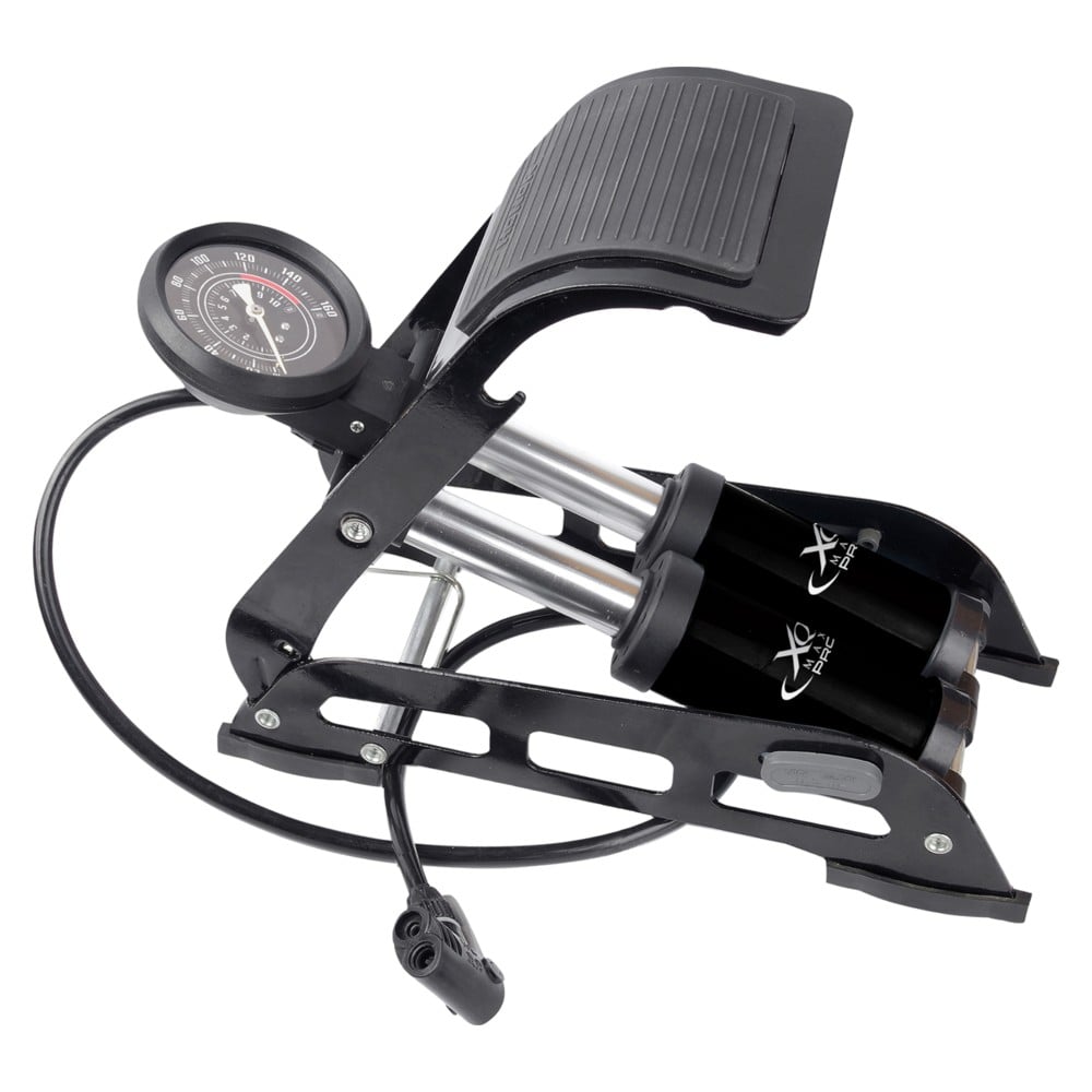 Pompe per biciklete, XQMAX eshte e pajisur me një pedale fryrjeje të gjerë, jo të rrëshqitshme dhe të rehatshme, Pompa është e pajtueshme me tre lloje të valvulave: Schrader, Presta, Dunlop.Ka tre adaptorë shtesë për fryrjen e topave dhe më shumë, tubi ka një sistem të veçantë mbylljeje që mbërthehet në valvul.Dizajni me 2 piston lejon fryrje të shpejtë të p.sh. një dyshek dhe është e pajisur me një tregues të madh (matës presioni)