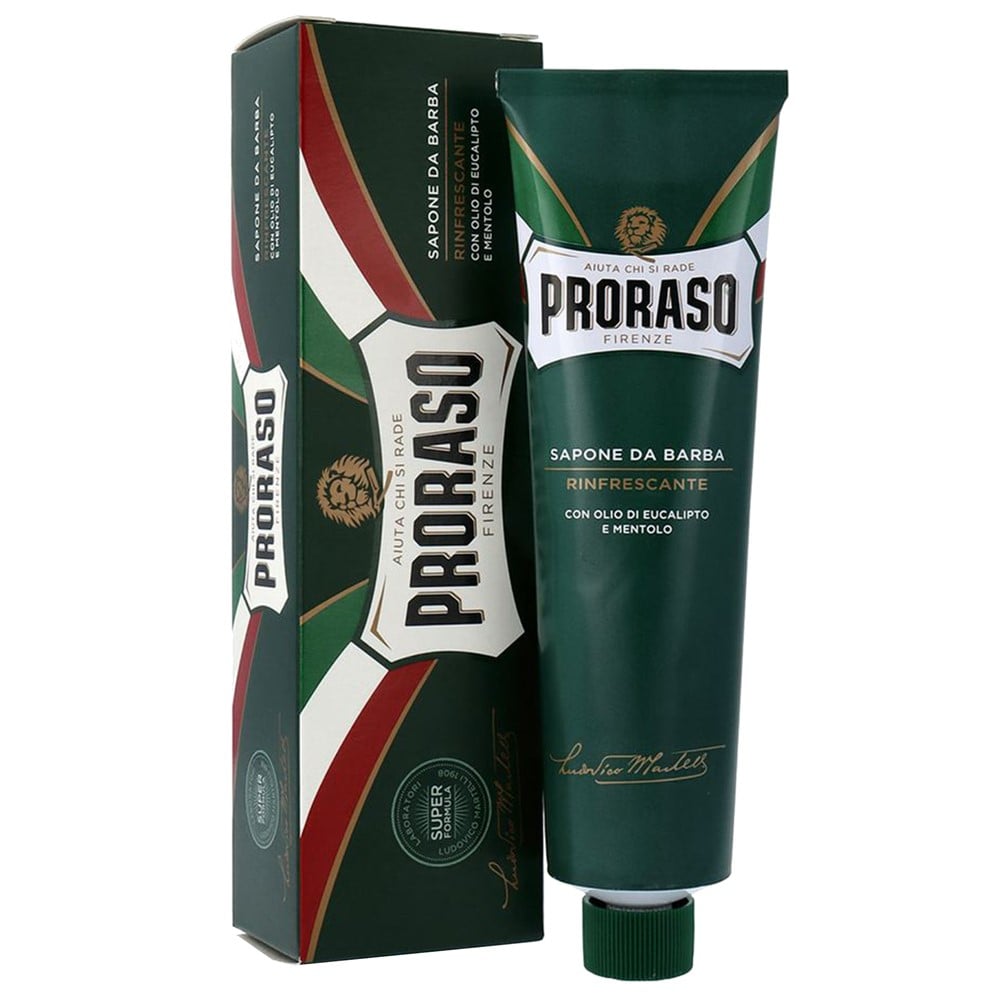 Proraso Krem Rroje Tube Eukalipt & Mentol. Një formulë me burim natyral krijon një shkumë të pasur kremoze që zbut mjekrën përpara rruajtjes duke e mbajtur lëkurën të qetësuar gjatë gjithë kohës, pa Paraben, duke përdorur vetëm përbërësit më të mirë natyralë në dispozicion. Vaji eukalipt ofron një efekt tonifikues, duke pastruar lëkurën ndërsa një spërkatje ushqyese e vajit të kokosit siguron që ajo të mos thahet. Një ndjesi freskuese pas rruajtjes mund t'i atribuohet mentolit, duke punuar në lidhje me mënyrën sesi baza e glicerinës redukton irritimin. Perdorimi:. Lagni furçën e rruajtjes me ujë të ngrohtë. Aplikoni rreth 2 cm krem Proraso Shaving Tube Eucalyptus & Menthol në qime dhe masazhoni fytyrën me lëvizje rrethore.
