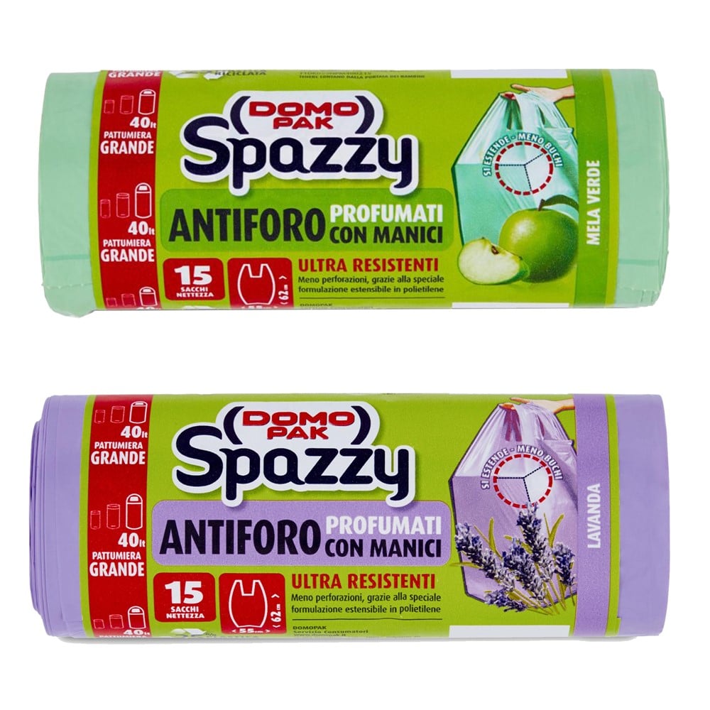 Falë formulimit special të zgjerueshëm në polietileni, është ultra rezistente dhe më pak i prirur ndaj çarjeve dhe çarjeve. Lehtë për t'u mbyllur dhe mbajtur falë dorezave praktike të inkorporuara. Ju mund të zgjidhni aromën që ju pëlqen më shumë duke zgjedhur nga livando, mollë jeshile, fllad alpin dhe portokalli. Domopak Spazzy Antiforo Profumato është gjithashtu ekologjik. Redukton ndikimin mjedisor sepse prodhohet me 25% plastikë të ricikluar pas konsumit dhe nga ana tjetër është e riciklueshme