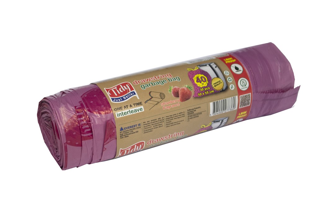 Qese mbeturinash prej materiali plastik rezistent, me kapacitet mbajtës 40 l, me aromë luleshtrydheje, në ngjyrë rozë. Materiali përbërës përmban aditiv për biodegradim në natyrë për 24-36 muaj nga prodhimi dhe është 100 % i riciklueshëm. Përdoret për t'u vendosur në koshat e mbeturinave, duke bërë paketimin e mbeturinave, pa lënë papastërti. Ky produkt është i përshtatshëm për përdorim në ambiente shtëpie dhe në ambiente profesionale, si hotele, restorante, zyra, etj.