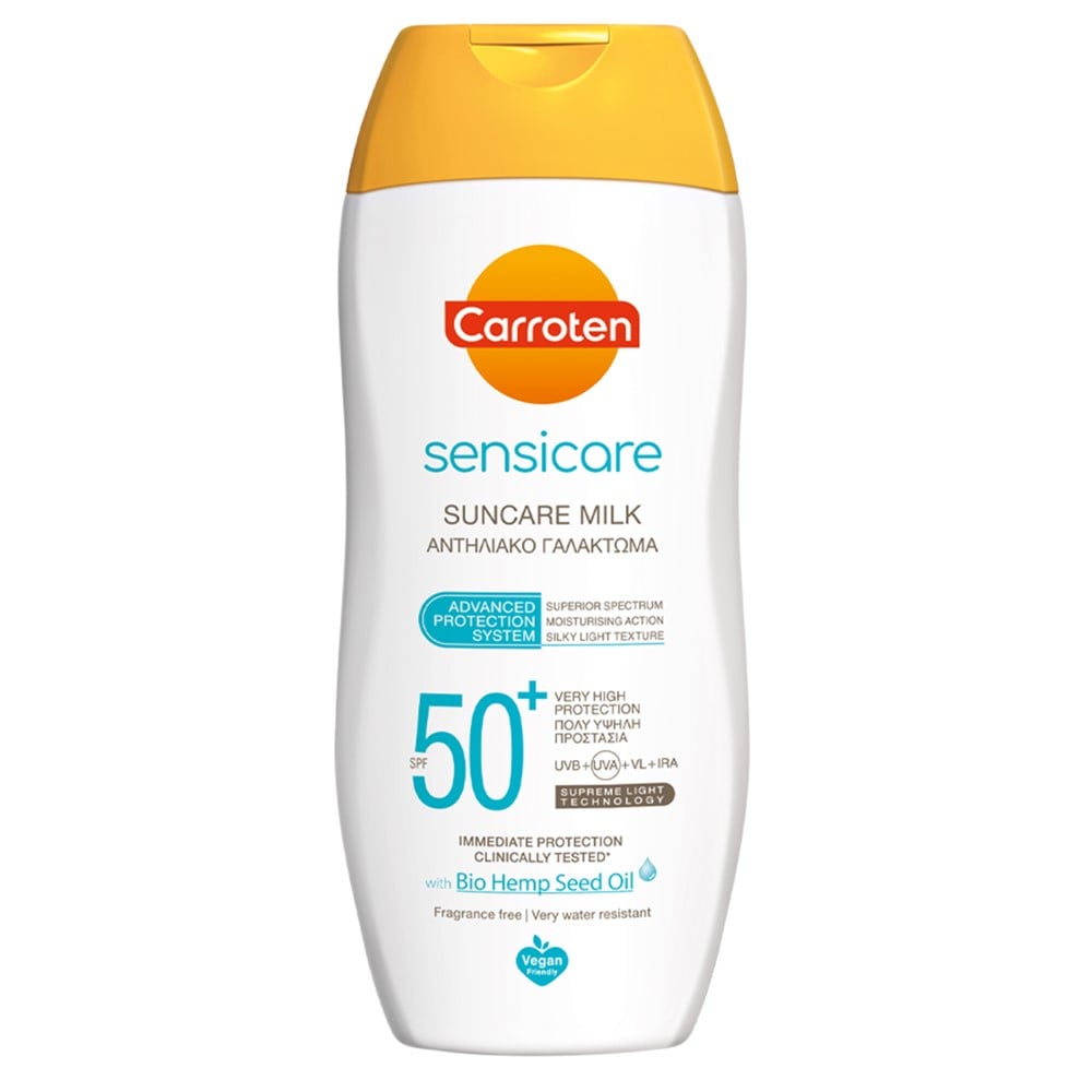 Qumesht kundër diellit, Sensicare SPF50+, ofron mbrojtje shumë të lartë ndaj diellit për lëkurën. E krijuar posaçërisht për lëkurë të ndjeshme, përmban vaj organik të farës së kërpit, duke ofruar kujdes dhe mbrojtje afatgjatë. Formula e butë, pa aromë është projektuar posaçërisht për të minimizuar rrezikun e një reaksioni alergjik. Sistemi 4-fish i mbrojtjes (UVB+UVA+VL*+IRA*), për mbulim të gjerë nga dielli nga spektri më i madh i rrezatimit të dëmshëm UV dhe infra të kuqe, përgjegjës për plakjen e parakohshme dhe dëmtime të tjera të lëkurës.