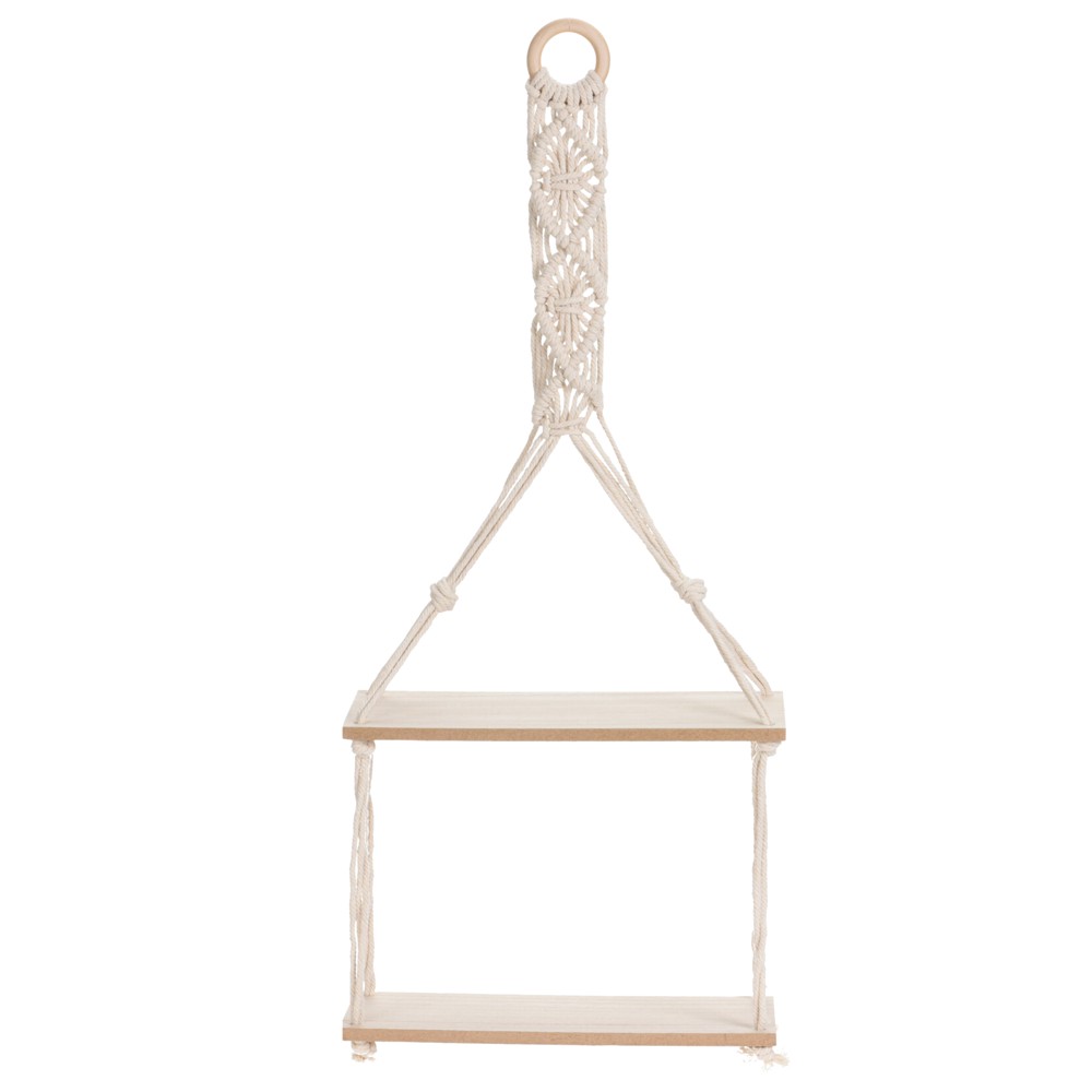 Raft i varur me dy nivele në një stil minimalist. Raftet e bëra nga mdf janë varur në një varg të gërshetuar në stilin e makrame. Do të duket bukur në ambiente papafingo, skandinave, industriale, minimaliste apo moderne.