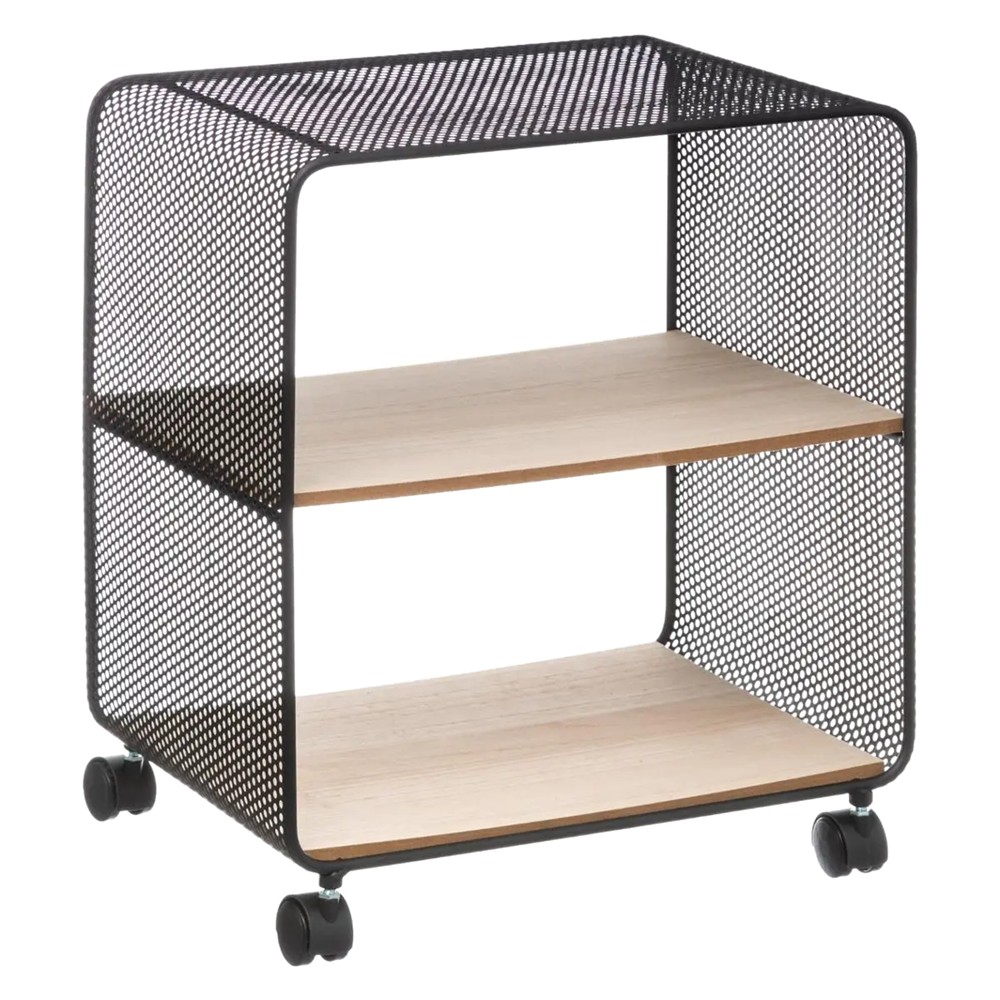 Raft metalik me 2 kate. Material mdf/metal me ngjyrë të zezë dhe kafe. Përmasat 43.5x27.8xH51 cm. Me rrota që bën të mundur lëvizjen sa më të lehtë. Praktik dhe shumë funksional për ambientin tuaj.