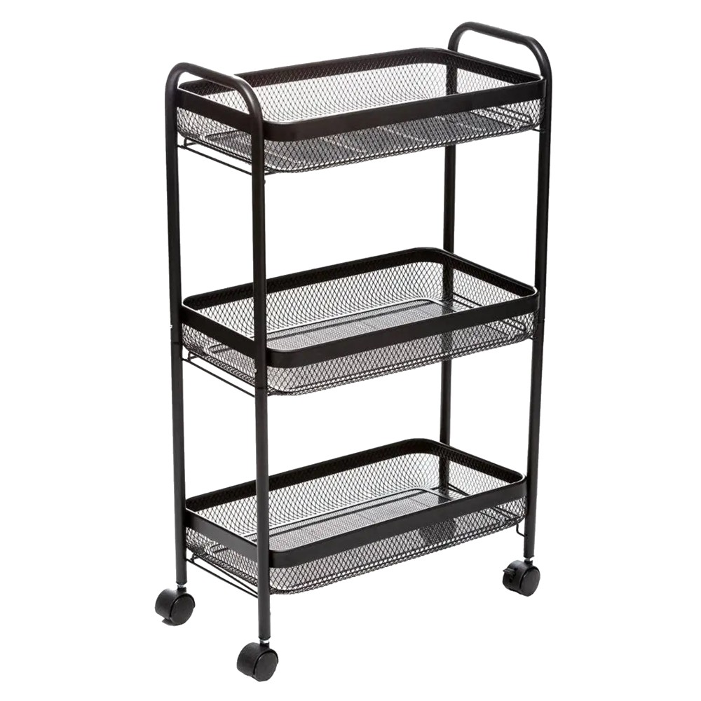 Rafti mbajtës lëvizës me 3 kosha metalikë. Mund të mbajë çdo gjë që ju dëshironi si psh: ushqime, pije, produkte pastrimi. Ju gjithashtu mund ta përdorni këtë organizues në tualetin tuaj për të vendosur detergjentët ose shampot tuaja, si dhe në garazh për të ruajtur produktet produktet ose artikujt e kopshtit. Falë rrotave, ky raft mund të zhvendoset shpejt.