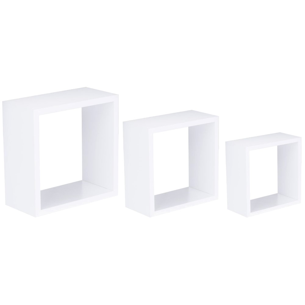 Set me rafte modulare të vetëqëndrueshëm, në formë katrore, prej materiali melamine, me përmasa 10x27x27 cm, 10x24x24 cm dhe 10x21x21 cm, në ngjyrë të bardhë. Raftet mund të montohen lehtësisht dhe në mënyrë të shpejtë në mure dhe falë sistemit të fshehur të fiksimit, kllapat nuk mund të shihen, nuk ka nevojë për aksesorë për të fshehur bulonat ose vidat dhe instalimi nuk kërkon përdorimin e profileve. Ky set është i përshtatshëm për përdorim në ambientet e brendshme të dhomave të ndenjjes, dhomave të gjumit, zyrave, studiove, etj.
