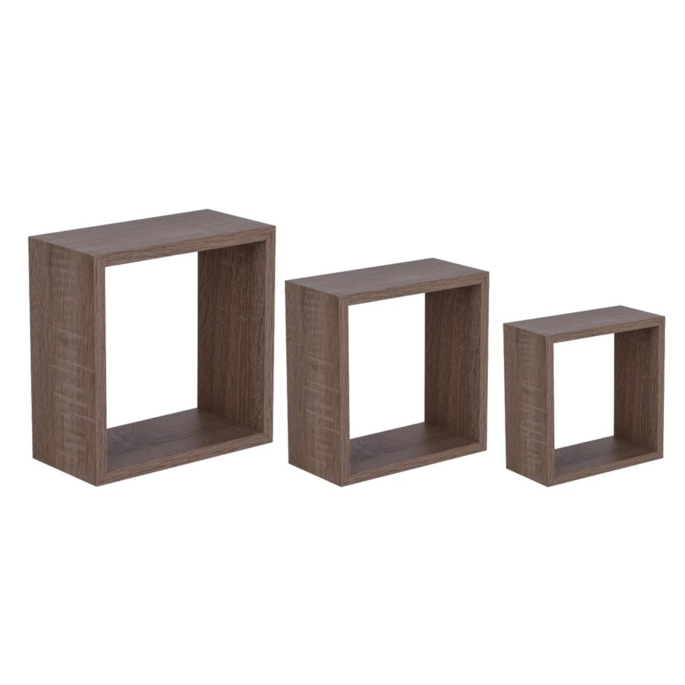 Set me rafte modulare të vetëqëndrueshëm, në formë katrore, prej materiali melamine, me përmasa 10x27x27 cm, 10x24x24 cm dhe 10x21x21 cm, në ngjyrë druri lisi. Raftet mund të montohen lehtësisht dhe në mënyrë të shpejtë në mure dhe falë sistemit të fshehur të fiksimit, kllapat nuk mund të shihen, nuk ka nevojë për aksesorë për të fshehur bulonat ose vidat dhe instalimi nuk kërkon përdorimin e profileve. Ky set është i përshtatshëm për përdorim në ambientet e brendshme të dhomave të ndenjjes, dhomave të gjumit, zyrave, studiove, etj.