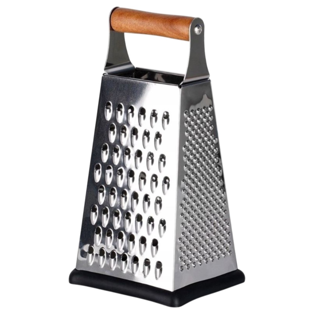 Rende 4 faqesh prej inoksi me ngjyrë argjendi dhe përmasa 11x9x2 cm është një mjet shumëfunksional dhe i qëndrueshëm për përgatitjen e ushqimeve në kuzhinë. Çdo faqe e rendes ofron një lloj të ndryshëm rendejeje, nga më i imti deri te më i trashi, që ju lejon të grijë, thërrmojë, apo copëtojë perime, djathë, fruta dhe çokollatë me lehtësi. Materiali inoks siguron rezistencë ndaj korrozionit dhe përdorim afatgjatë, ndërsa dizajni kompakt dhe ergonomik e bën këtë rende të lehtë për t’u mbajtur dhe përdorur.