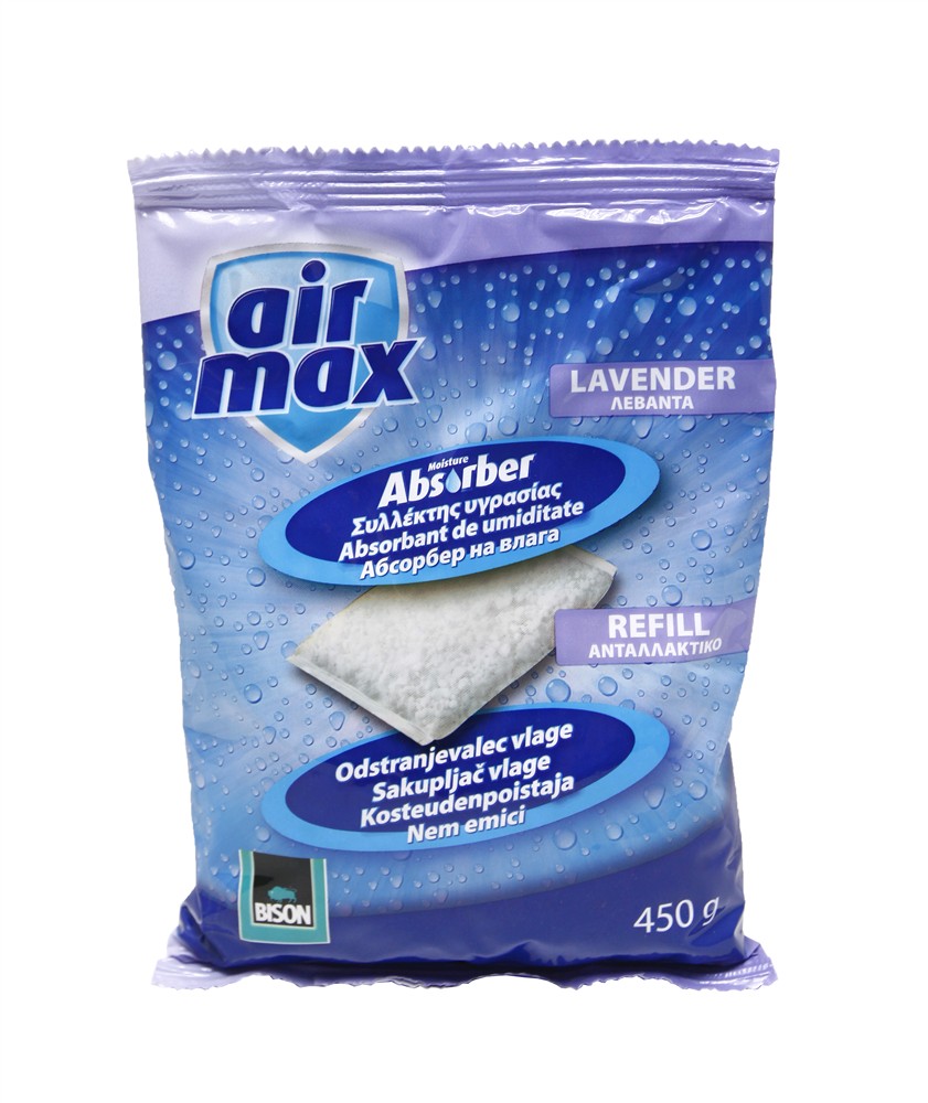 Qese praktike mbushëse për Air Max absorvues lagështire. Zvogëlon lagështirën e lartë të ajrit në dhoma të mbyllura me pak ose aspak ventilim. I përshtatshëm për anije, dollap rrobash, papafingo, bodrum, salla, kopësht, kuzhinë. Përhap një aromë të këndshme. 450 gr punon përafërsisht 3 muaj në një dhomë deri në 30 m ³. Një 450 ge mbushëse thith përafërsisht 0.5 litra ujë në varësi të temperaturës, lagështisë së ajrit dhe madhësisë së dhomës.