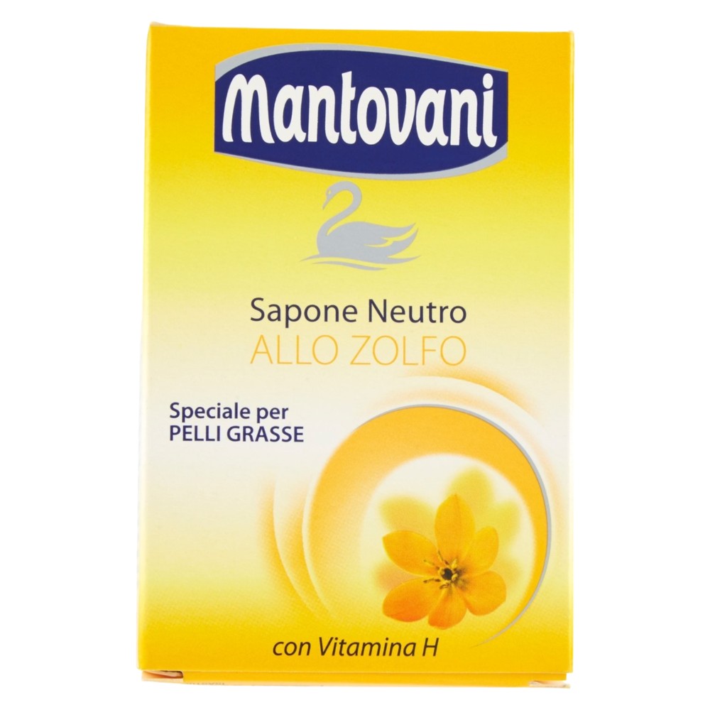 Sapuni Neutral squfuri Mantovani për lëkurë të yndyrshme pastron me shumë delikatesë falë bazës pastruese të përbërë kryesisht nga përbërës me origjinë bimore. Është ideal për lëkurën e yndyrshme, të papastër dhe të prirur ndaj akneve, falë veprimit rregullues të sebumit të squfurit. Është gjithashtu i pasuruar me vitaminë H e cila ka veti ribalancuese. I testuar dermatologjikisht.