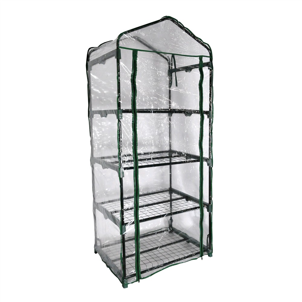 Serë lulesh dhe bimësh, me 4 rafte, 69x49x160H cm. E ndërtuar me strukturë tubash çeliku dhe këmbë mbështetëse prej PVC- je. Mbulesa prej polietileni transparent e cila hapet dhe mbyllet me anë të zinxhirit. Shumë e përshtatshme për të kultivuar bimë të ndryshme.