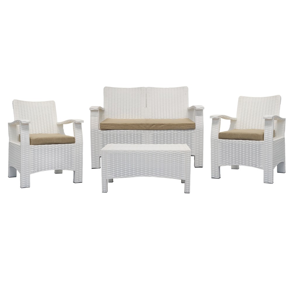 Set 2 kolltuk tek me shilte + 1 kolltuk dopjo me shilte + 1 tavolinë mesi, ratan plastik, e barhdë/bezhë, teku 56x64xH89 cm / dopjo 56x118xH89 cm / tavolina 48x85xH42 cm